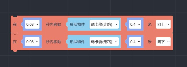 將積木設定「在0.08秒內移動 形狀物件碼卡龍(走路) 0.4米 向上」,複製第二個設定向下。距離和速度可自行做調整。