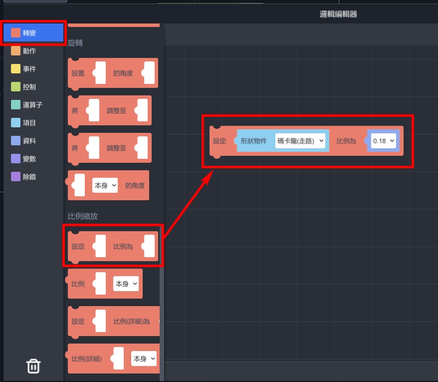 1. 從「轉變」>「比例縮放」,拉出「設定…比例為…」,設定碼卡龍的比例為0.18。