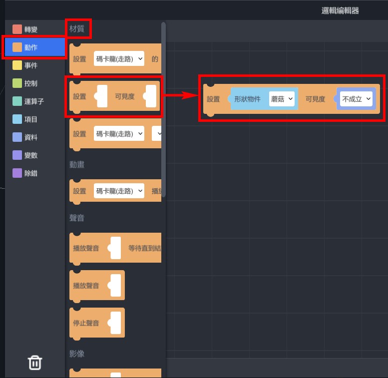 1. 從「動作」>「材質」,拉出「設定…可見度…」,設定蘑菇的可見度為不成立。