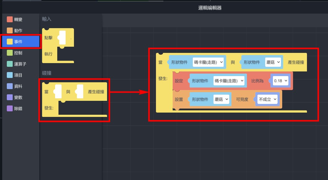 1. 從「事件」>「碰撞」,拉出「當…與…產生碰撞,發生…」,將上兩個積木放置於內,並設定碼卡龍與蘑菇碰撞。