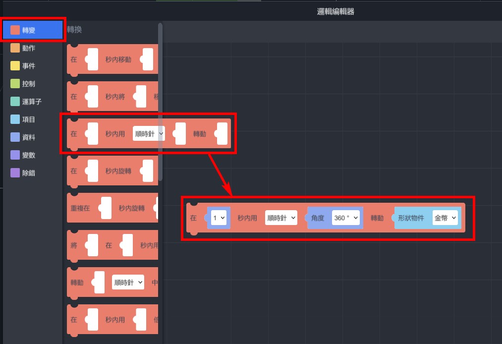 1. 從「轉變」>「轉換」,拉出「在…秒內用…時針…角度…轉動…」,設定「在1秒內 用順時針 角度360°轉動 形狀物件金幣」。