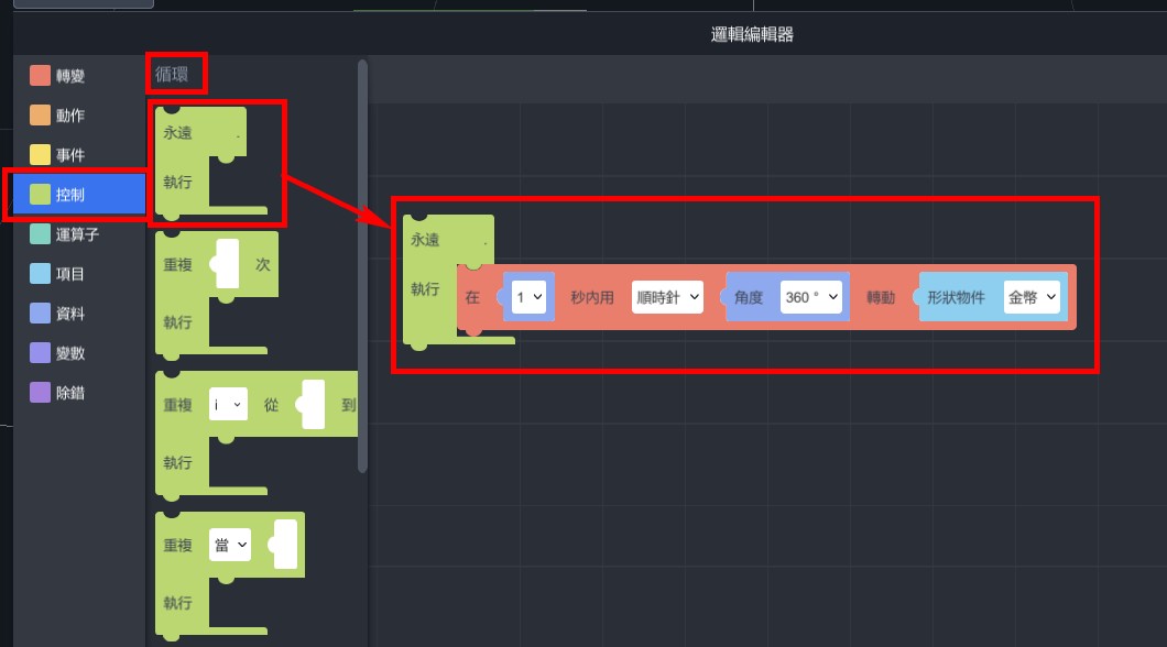 1. 從「控制」>「循環」,拉出「永遠執行…」,並將剛剛的積木放置於內。