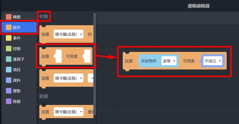1. 從「動作」>「材質」,拉出「設定…可見度…」,設定金幣的可見度為不成立。
