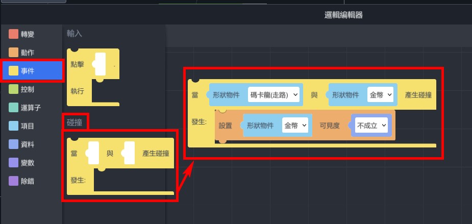 1. 從「事件」>「碰撞」,拉出「當…與…產生碰撞,發生…」,將上一個積木放置於內,設定碼卡龍與金幣碰撞。