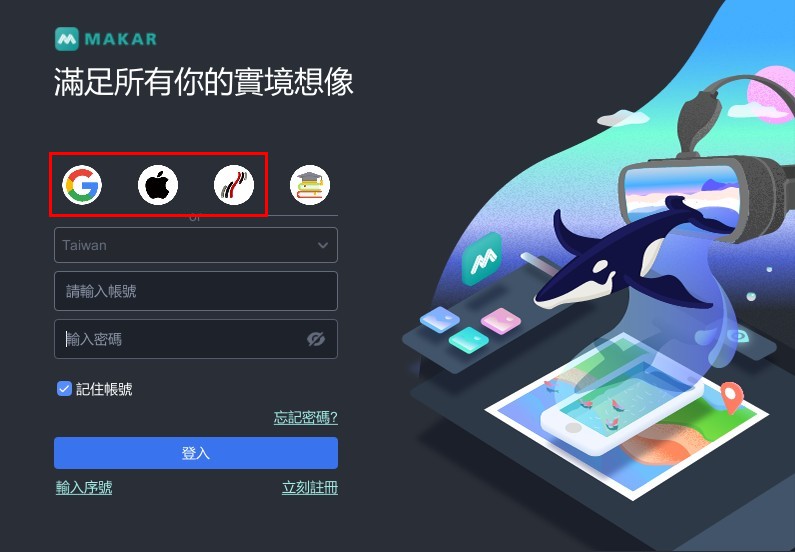 MAKAR 提供第三方登入,且註冊即登入,可快速完成您的帳號註冊,您可以從官方網站的 會員登入 或 MAKAR Editor 登入畫面,以第三方帳號登入使用。
