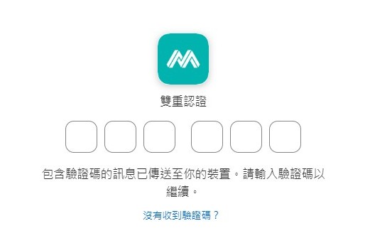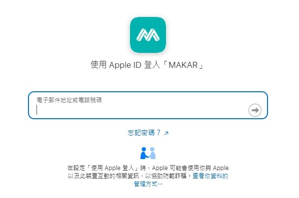 1. 點選  Apple 圖示後進入登入畫面,輸入您的登入資訊。 2. 使用 Apple 登入需啟用「雙重認證」,請至您的 Apple 裝置確認並輸入雙重認證碼。 *若此前已先啟用過,此頁面將不會出現。