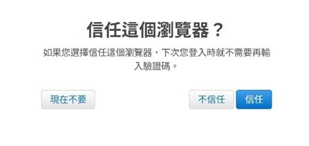 3. 跳出「信任這個瀏覽器?」畫面,點選「信任」。 4. 跳出「Apple登入的狀況」,點選「繼續」。