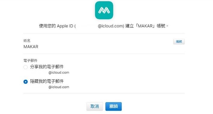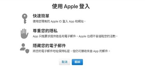 5. 確認您的Apple ID是否正確,可修改姓名及設定是否要分享Mail,設定完畢後點選「繼續」。 6. 跳出「登入完成」視窗。