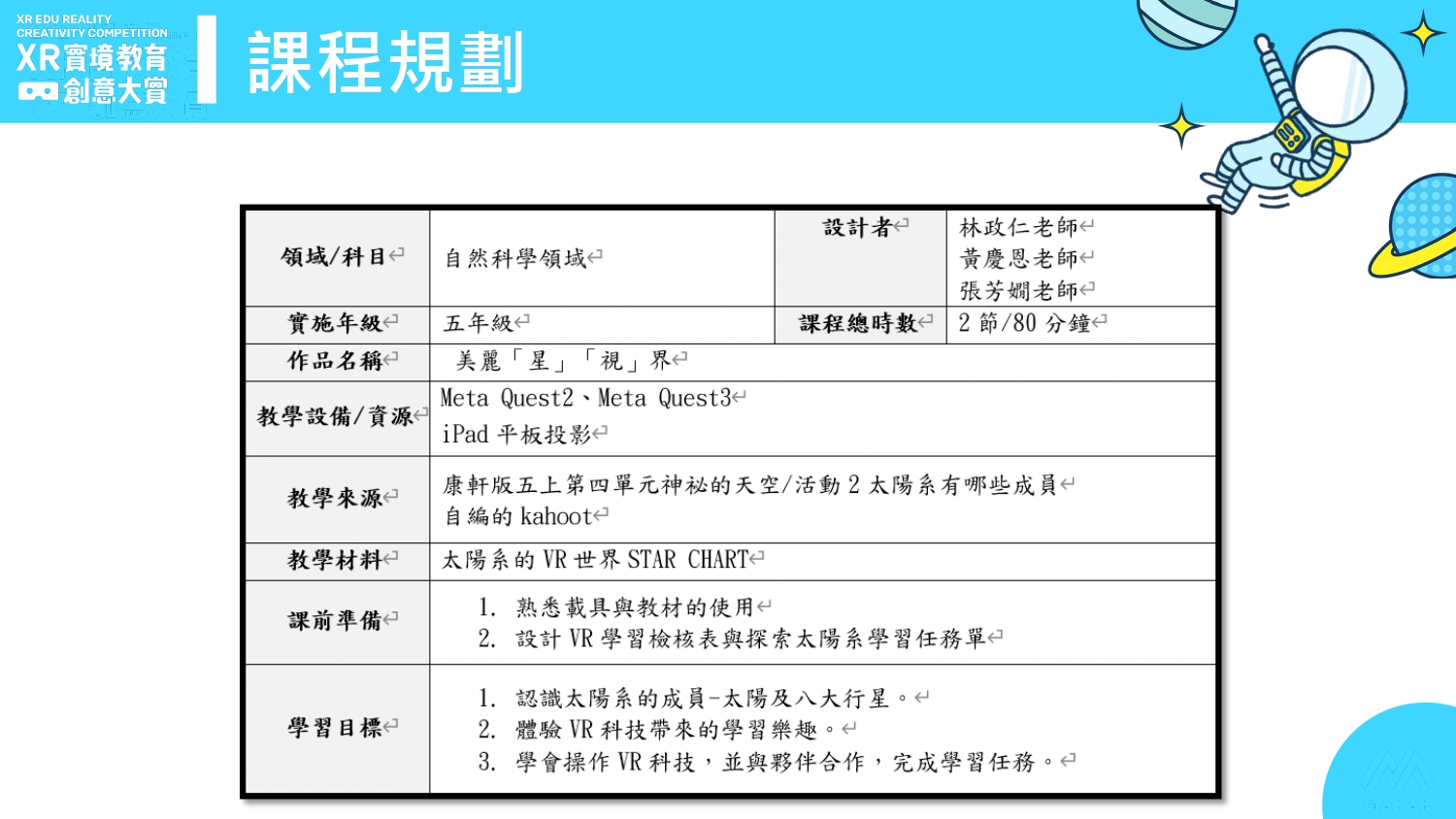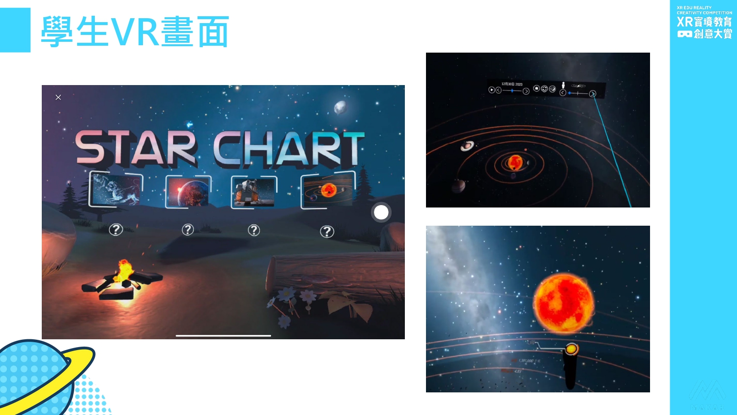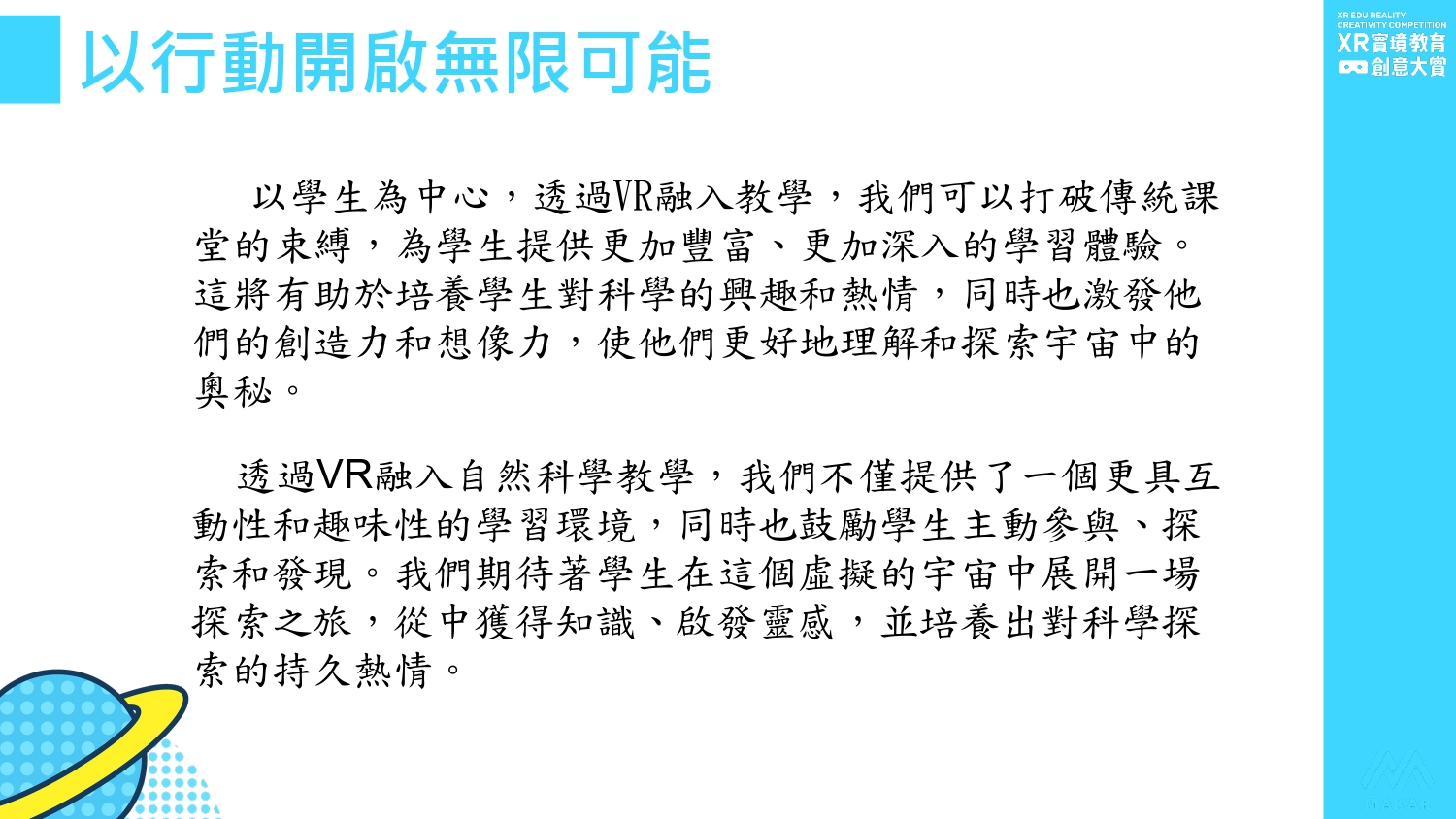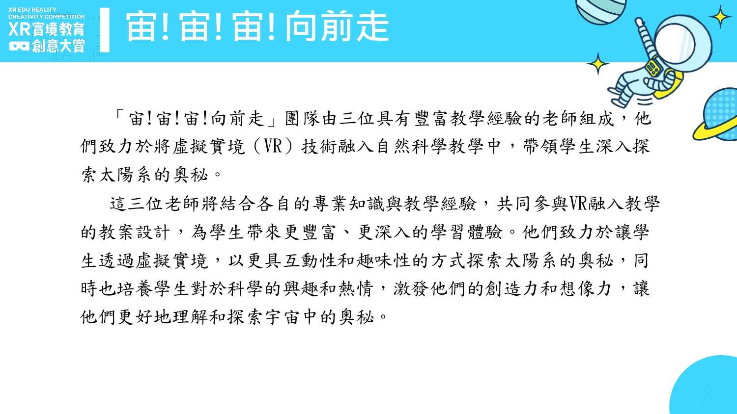 「宙!宙!宙!向前走」,創作作品「美麗『星』『視』界」,來自宜蘭縣羅東鎮成功國民小學,榮獲 2023 XR 實境教育創意大賞 教師組:VR融入教學 特優獎、教師組:XR新媒體內容教材創作 宏達電特別獎。