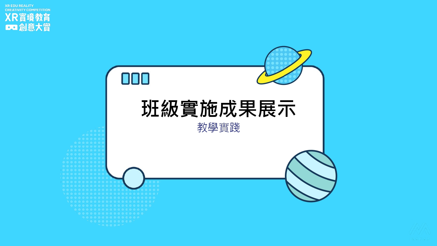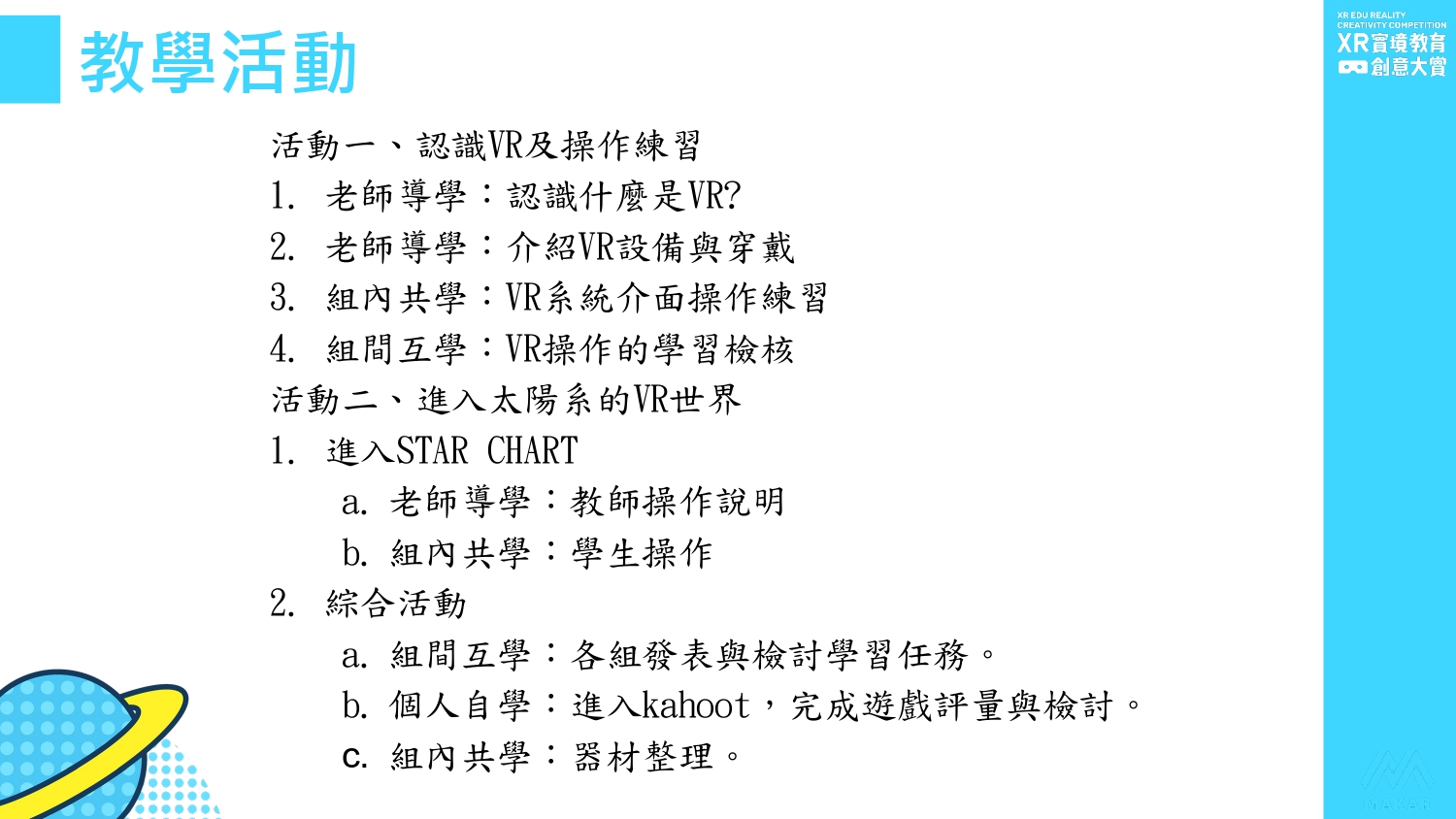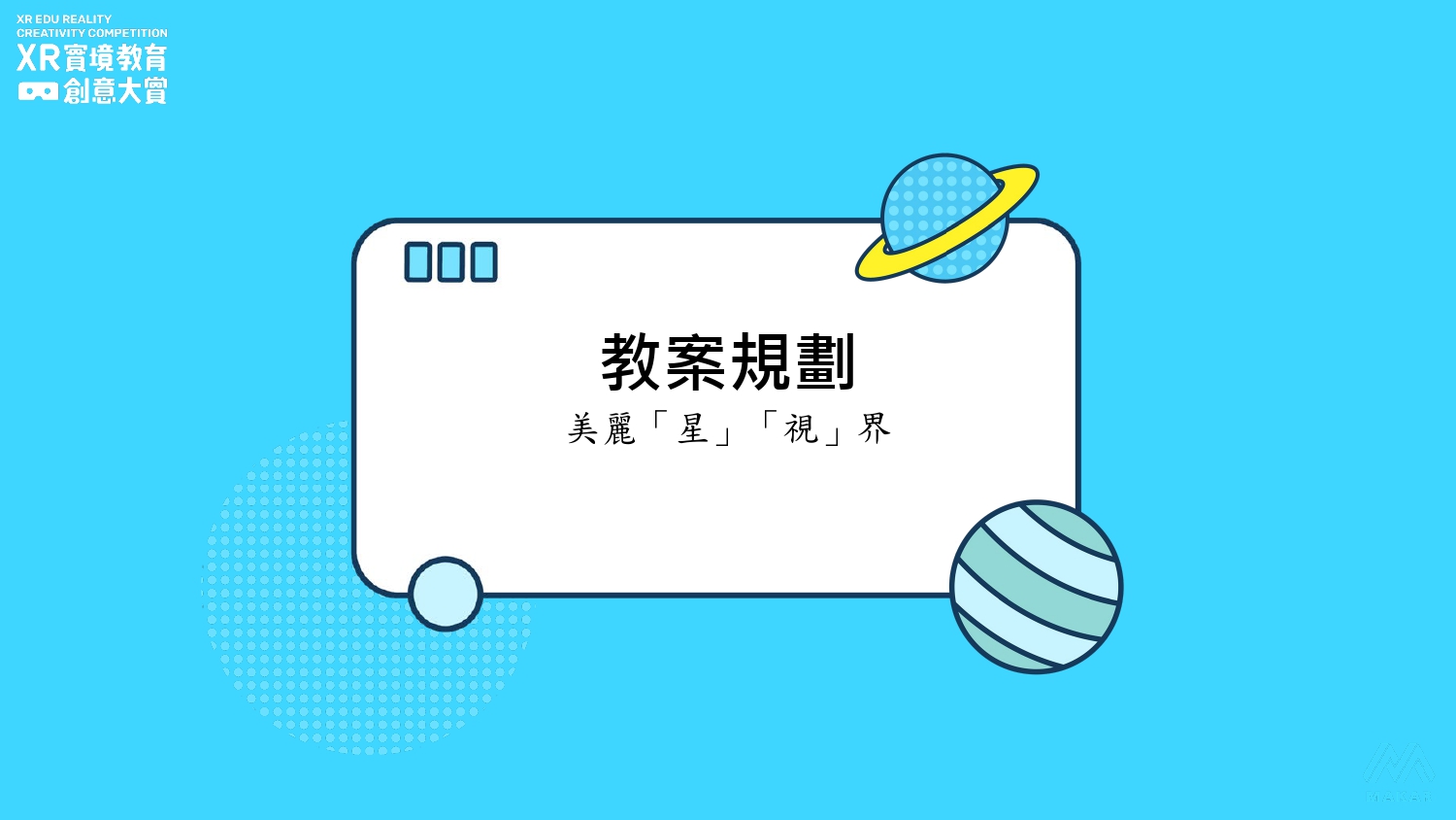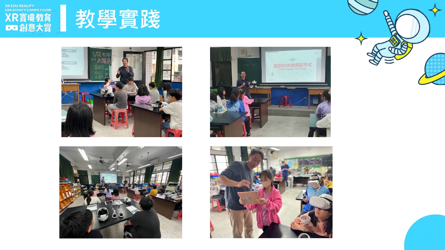 「宙!宙!宙!向前走」,創作作品「美麗『星』『視』界」,來自宜蘭縣羅東鎮成功國民小學,榮獲 2023 XR 實境教育創意大賞 教師組:VR融入教學 特優獎、教師組:XR新媒體內容教材創作 宏達電特別獎。
