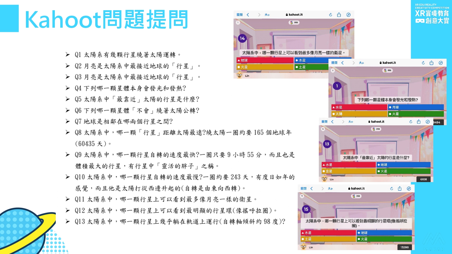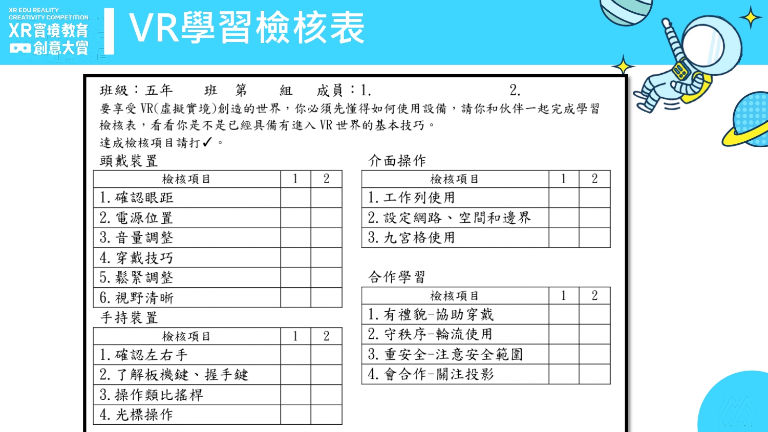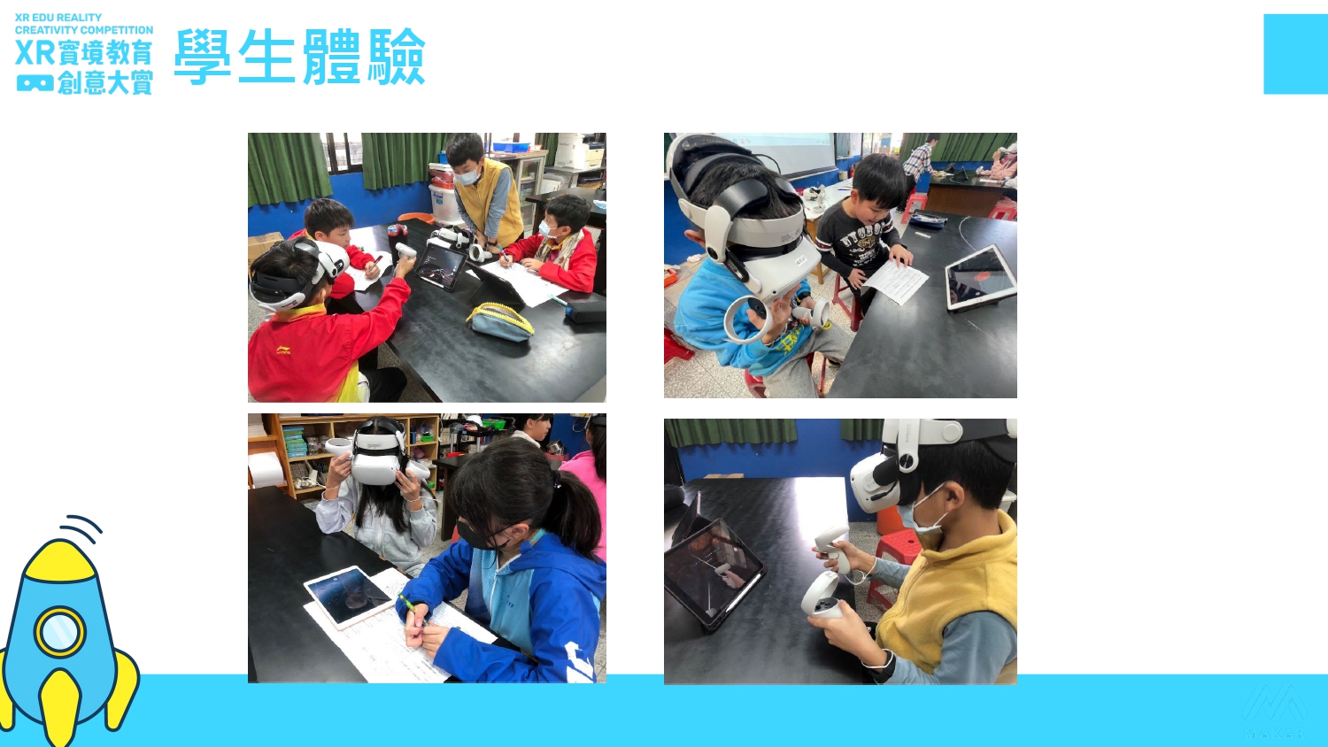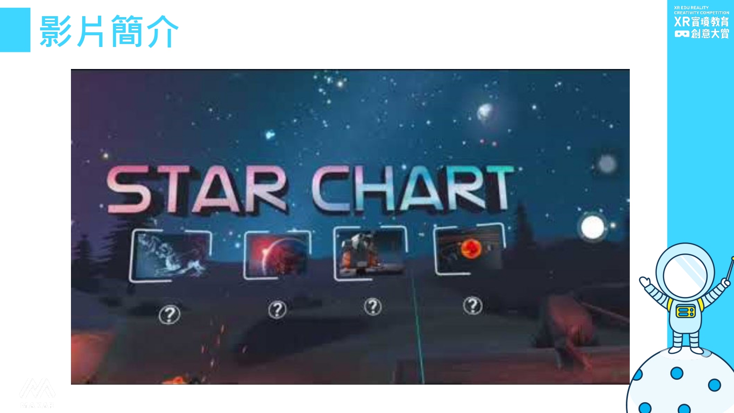 「宙!宙!宙!向前走」,創作作品「美麗『星』『視』界」,來自宜蘭縣羅東鎮成功國民小學,榮獲 2023 XR 實境教育創意大賞 教師組:VR融入教學 特優獎、教師組:XR新媒體內容教材創作 宏達電特別獎。