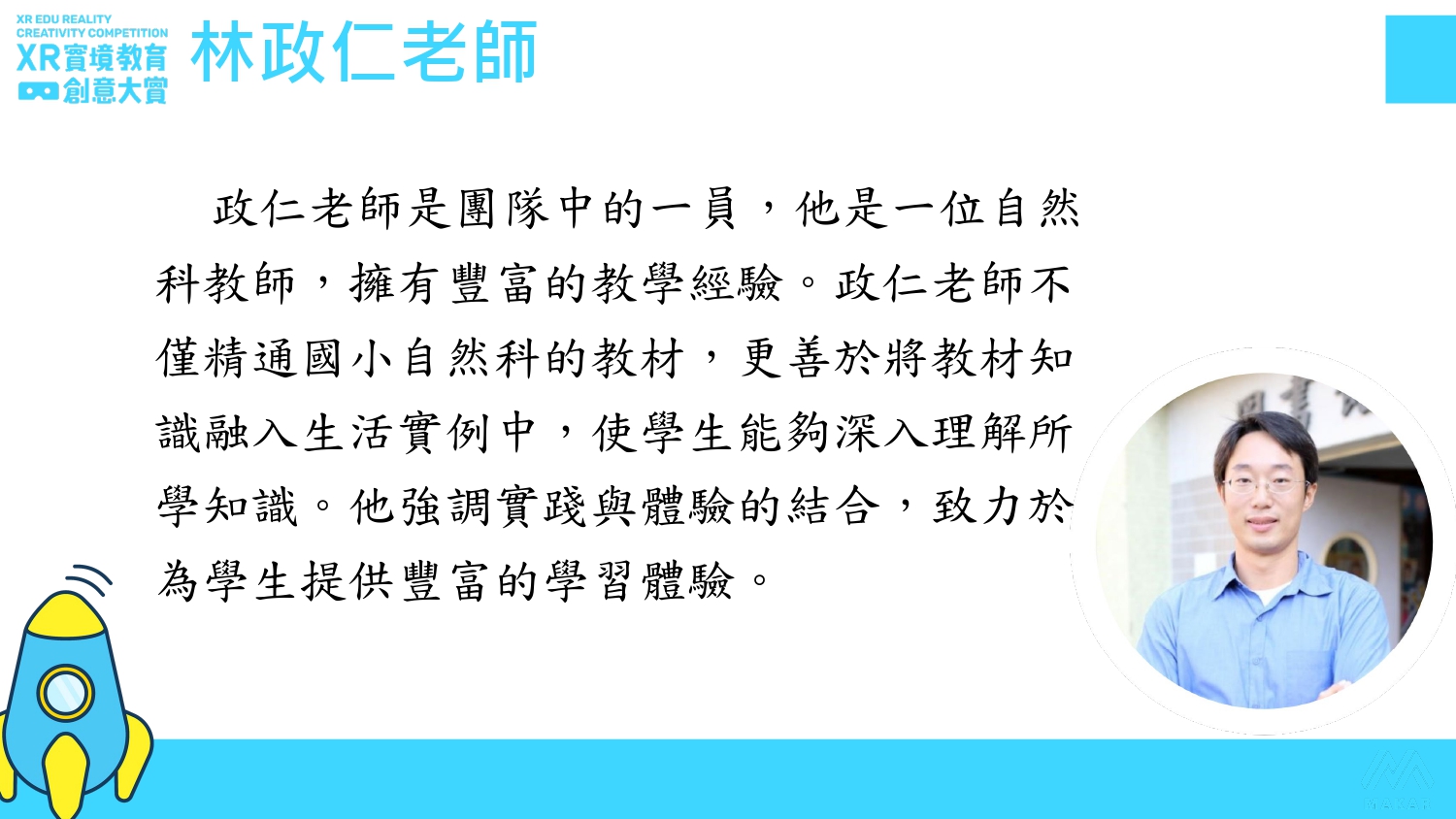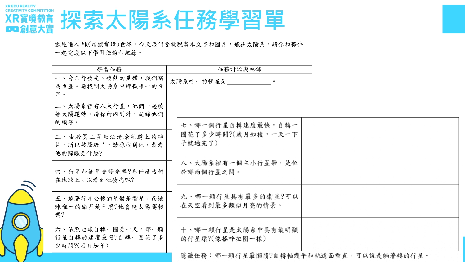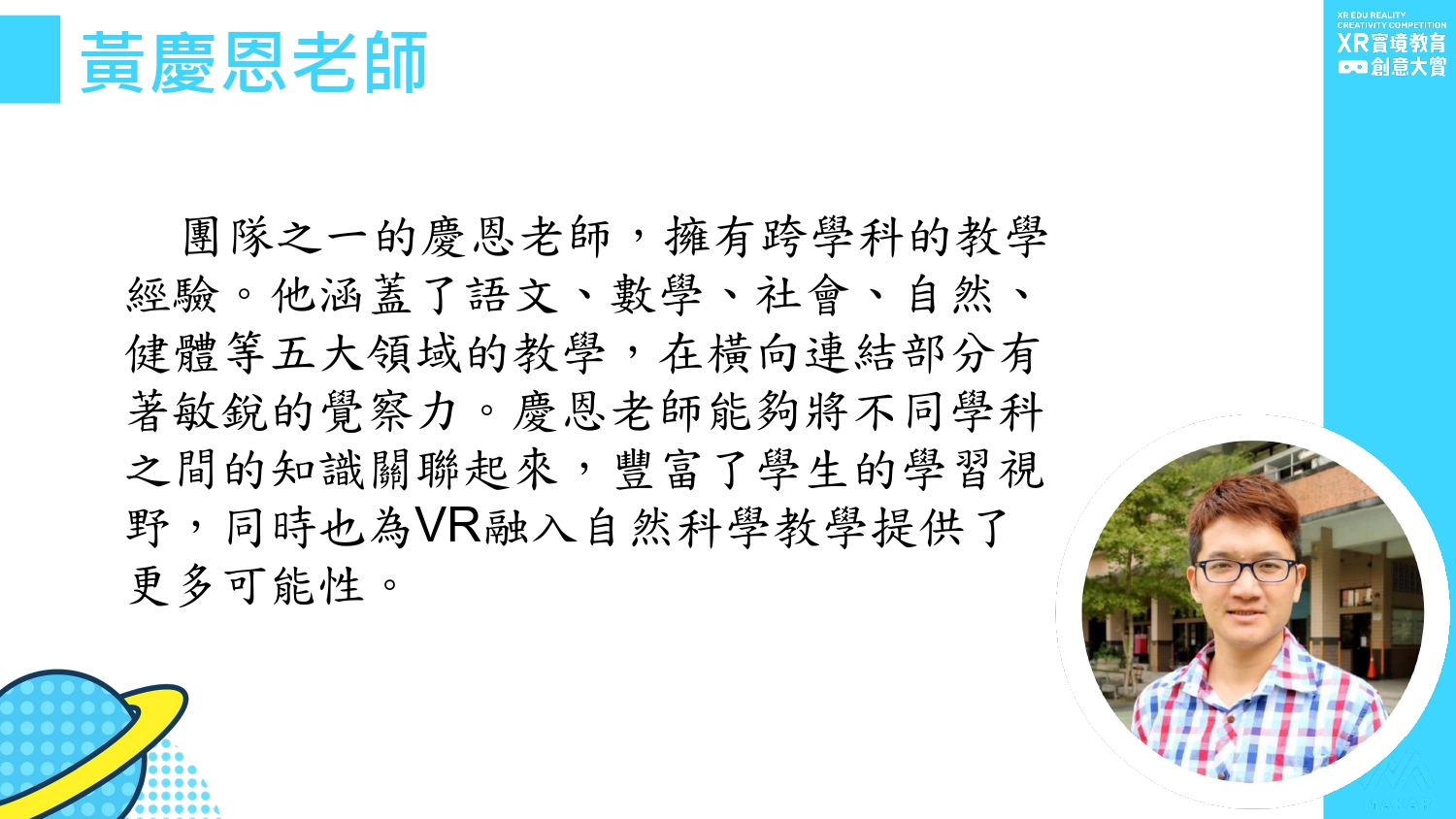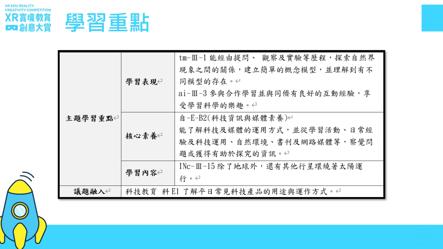 「宙!宙!宙!向前走」,創作作品「美麗『星』『視』界」,來自宜蘭縣羅東鎮成功國民小學,榮獲 2023 XR 實境教育創意大賞 教師組:VR融入教學 特優獎、教師組:XR新媒體內容教材創作 宏達電特別獎。