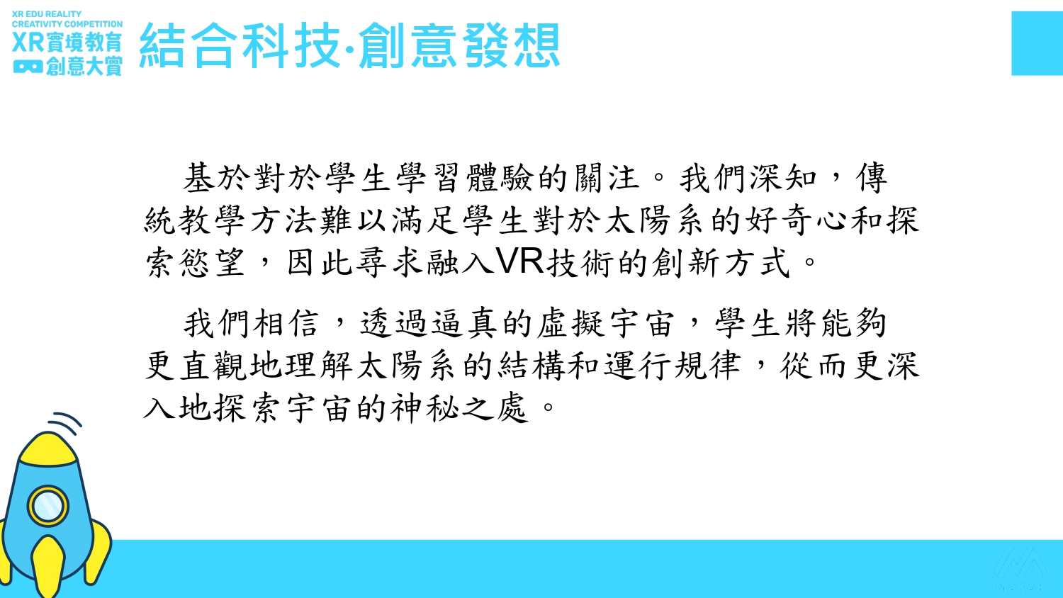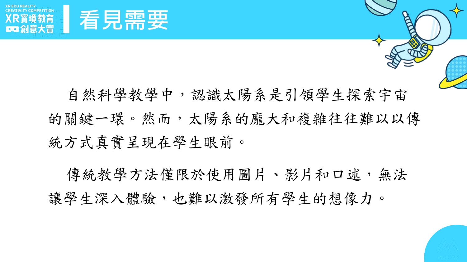 在自然科的教學中,認識太陽系是帶領孩子探索宇宙很重要的一部分,但這部分卻往往難以真實的展現在學生面前。傳統的教學方式可能只能運用圖片、影片,以及講述來教學,無法給予學生深入的體驗,也難以讓部分學生想像。因此,我們將 VR 融入教學,將太陽系帶入課堂,讓學生能夠身臨其境的探索宇宙奧秘。