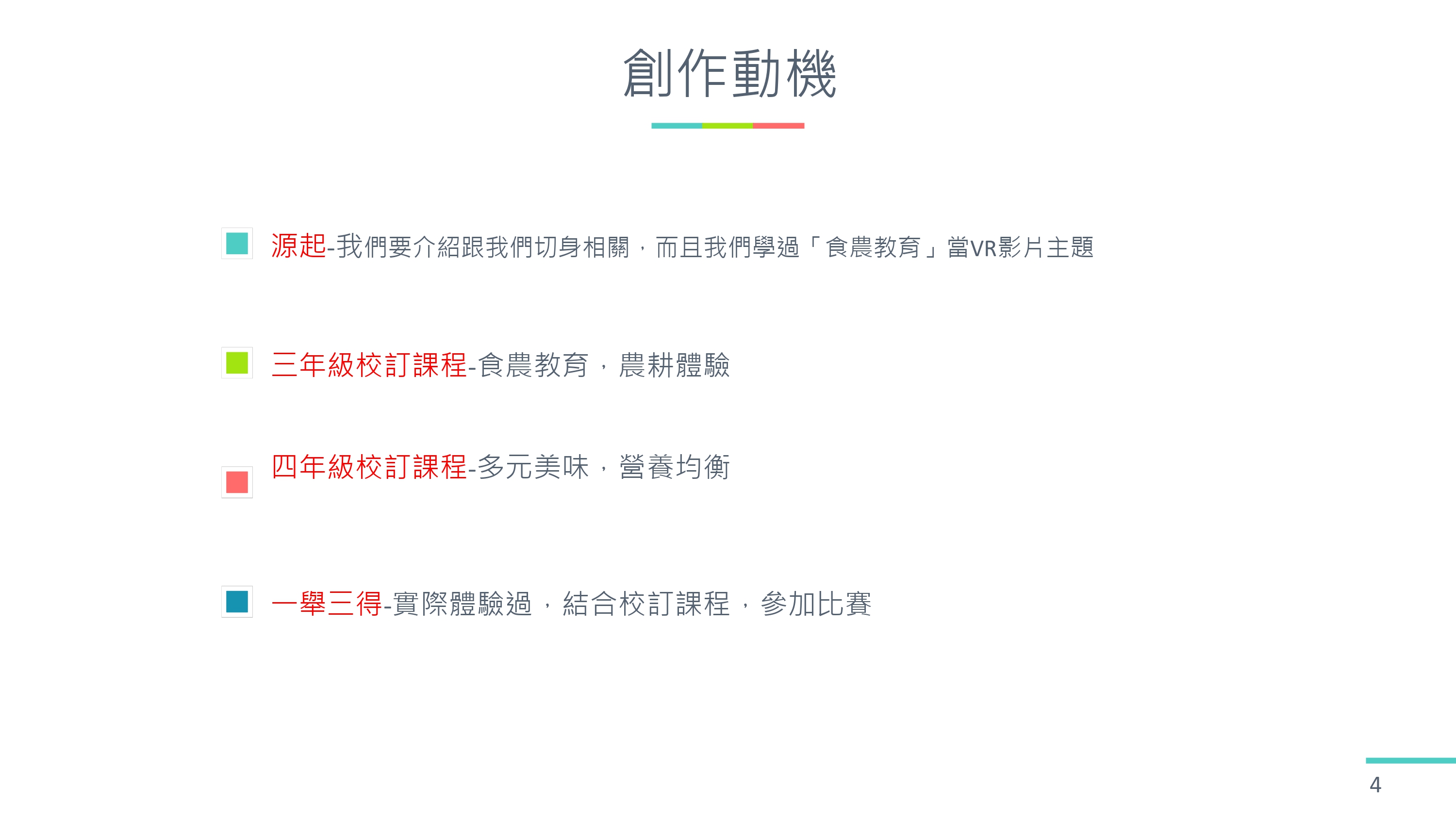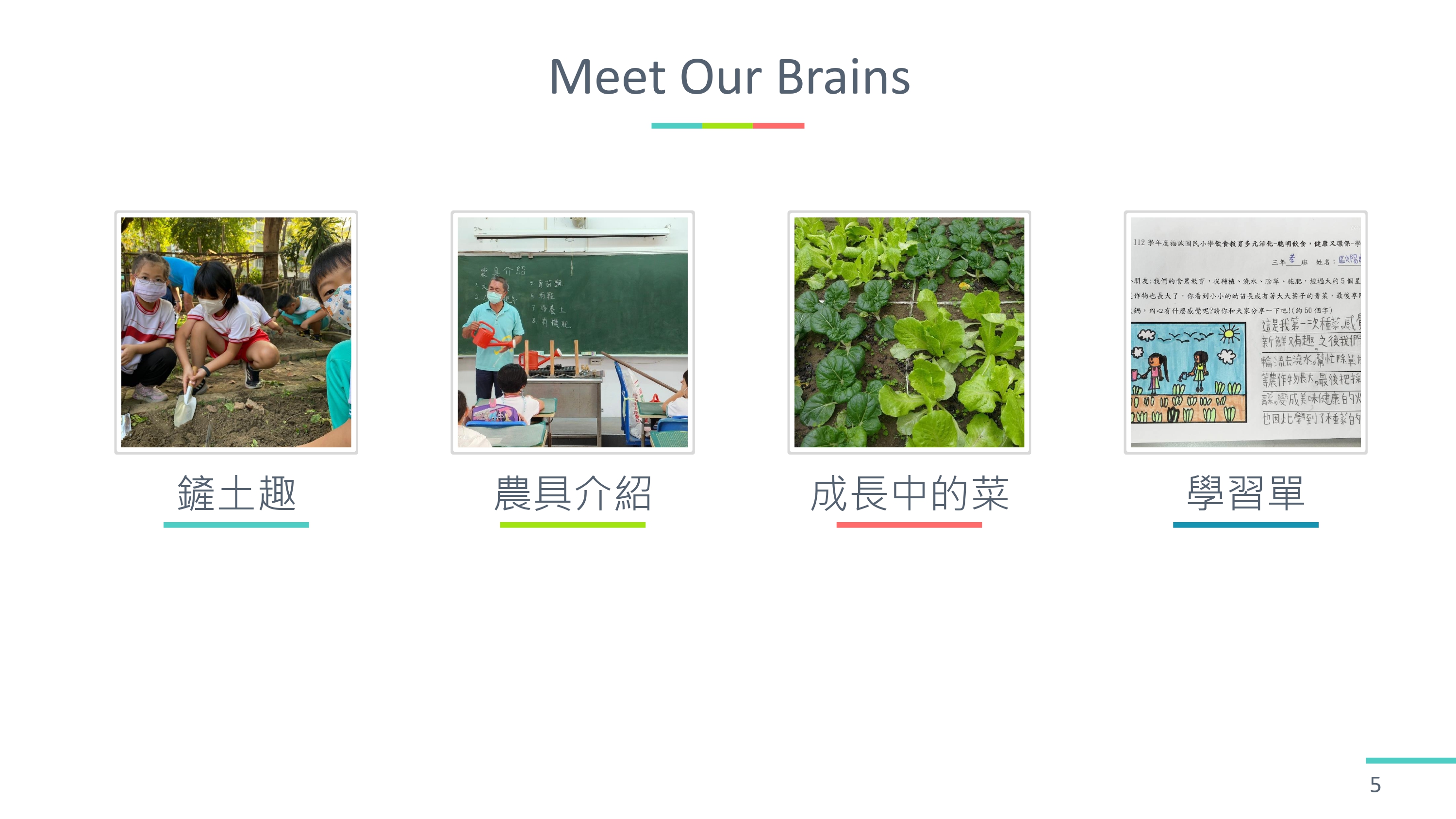 1. 我們覺得要製作學過的主題的影片,這樣才有把握把影片完整的介紹給大家。有同學提議,我們可以介紹我們在三、四年級實際動手做過的農耕體驗課程,介紹切身相關,而且學過「食農教育」當 VR 影片主題。