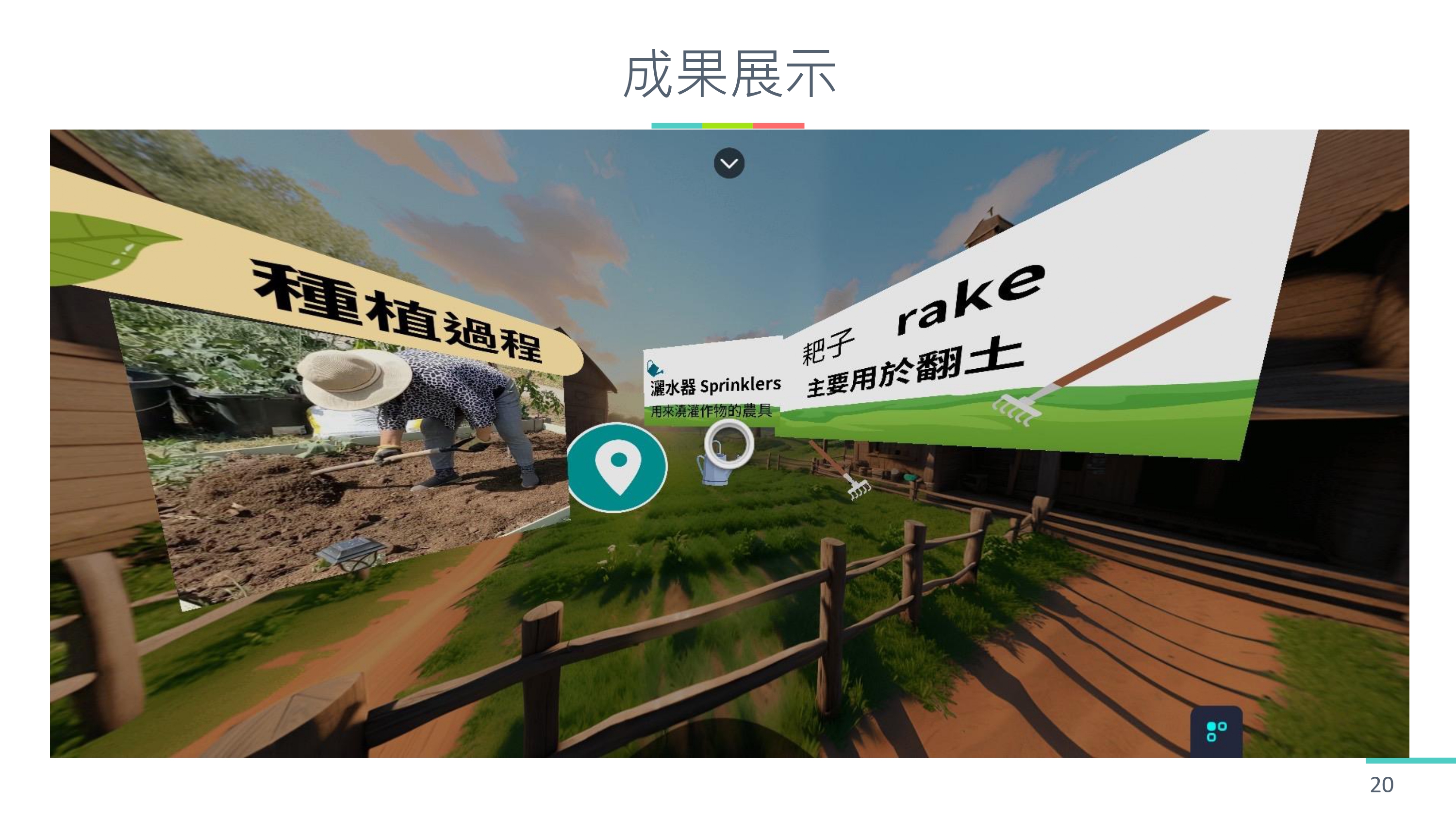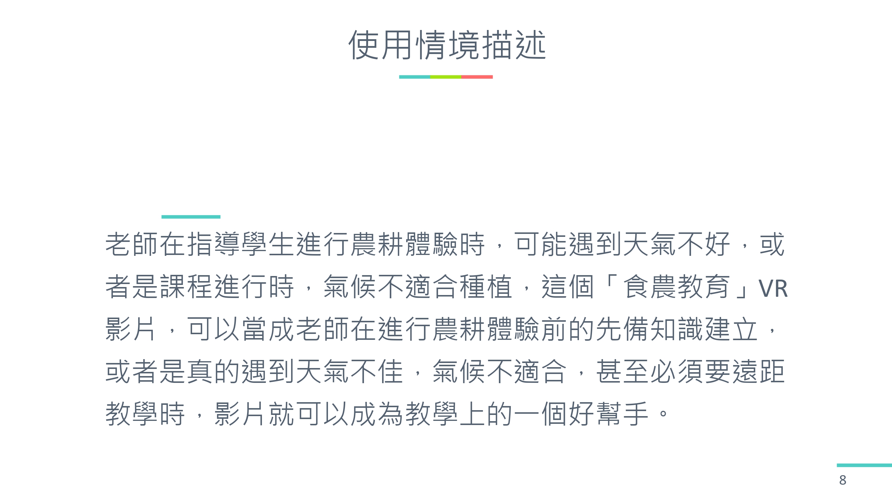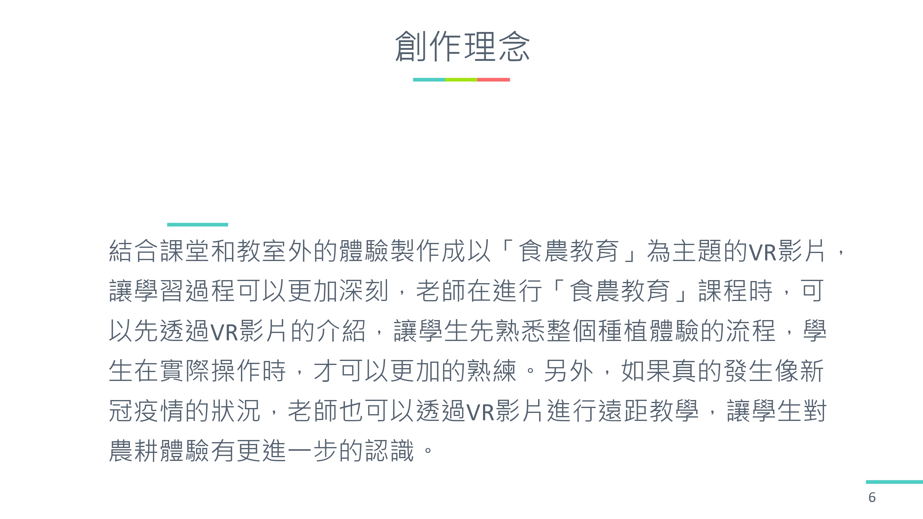 2. 這個 VR 影片可以讓整個農耕體驗的學習過程更加深刻,先透過 VR 影片的介紹,讓學生先熟悉整個種植體驗的流程,學生在實際操作時,才可以更加的熟練。老師也可以透過 VR 影片進行遠距教學,讓學生對農耕體驗有更進一步的認識。