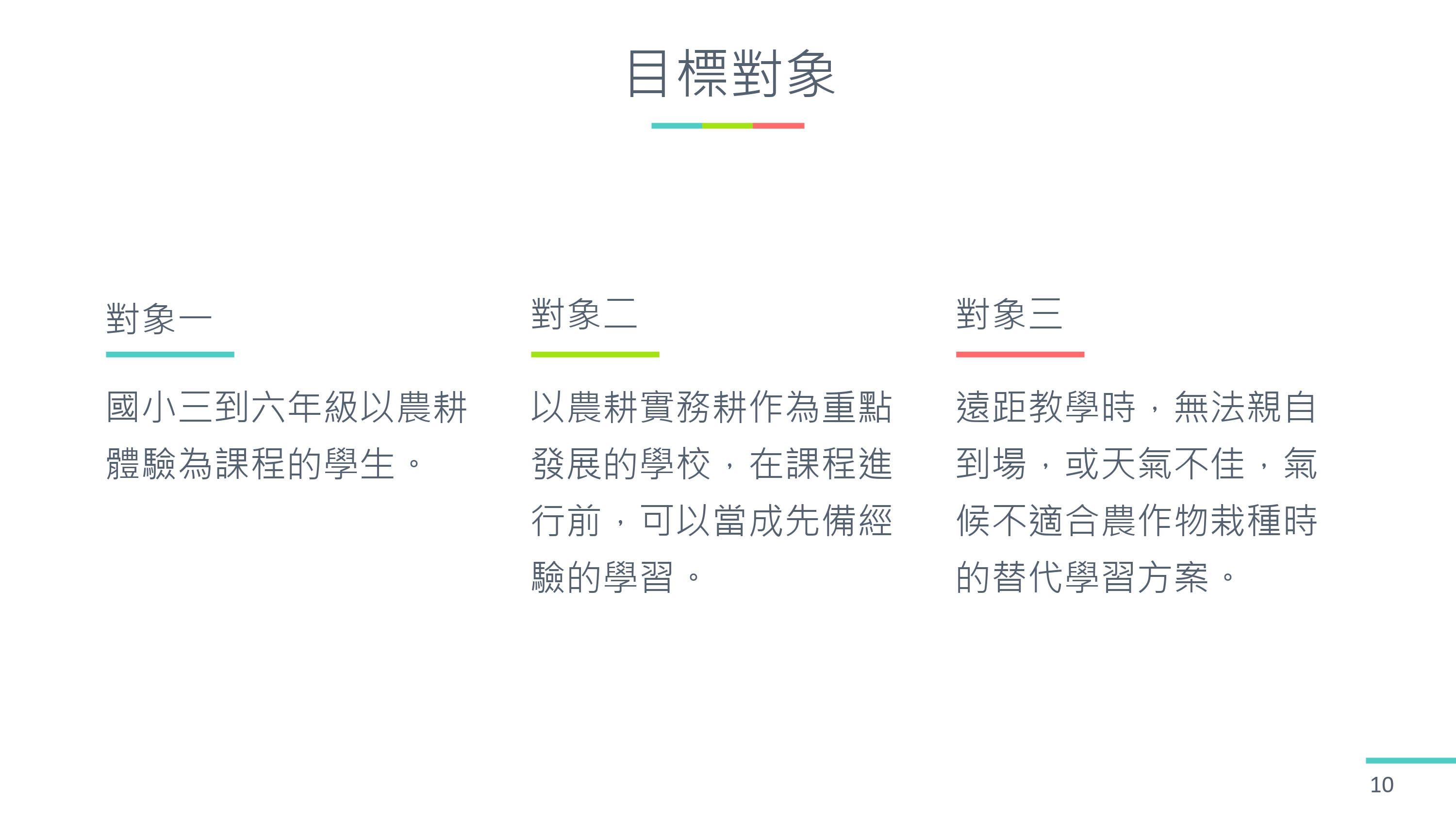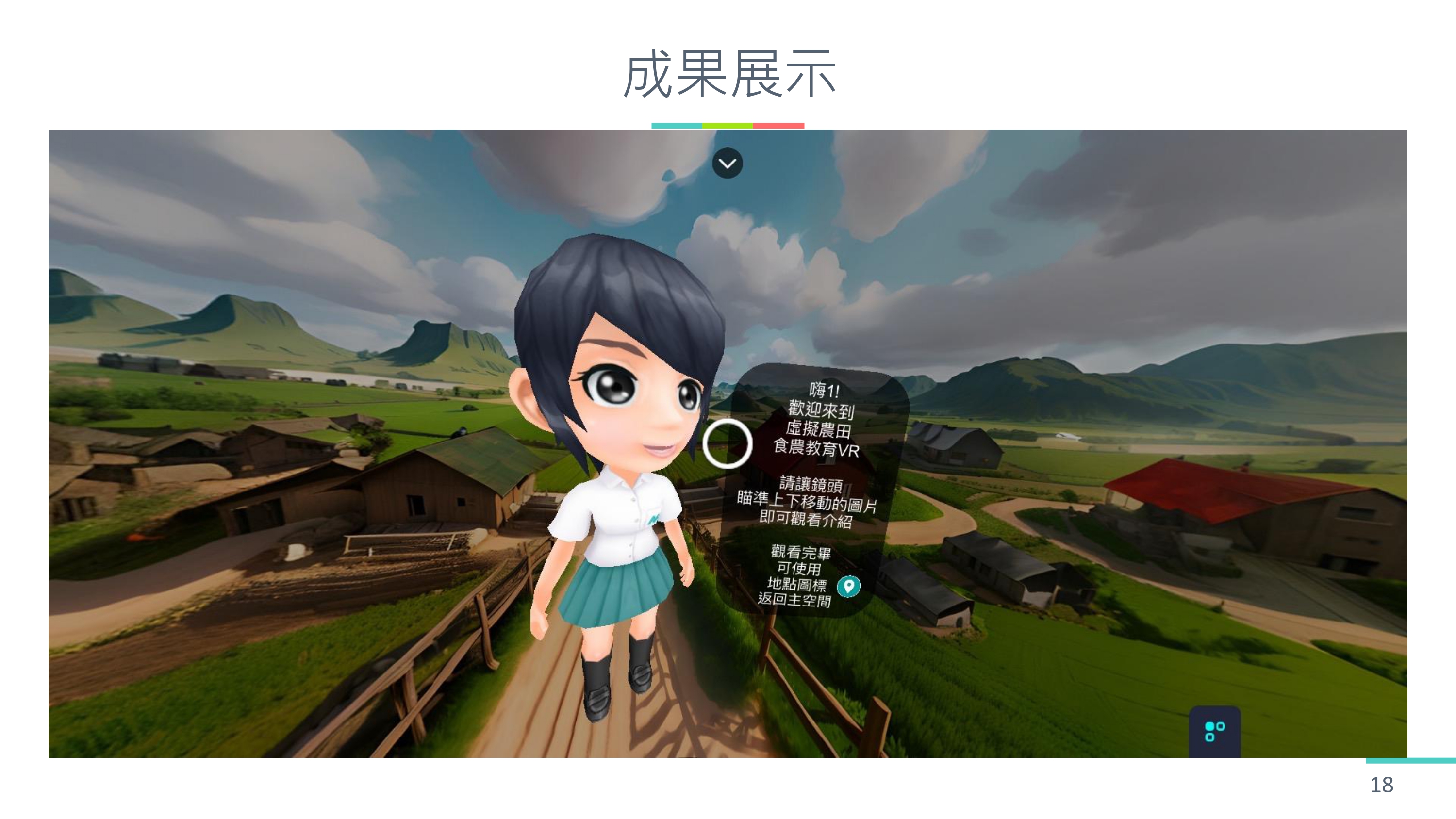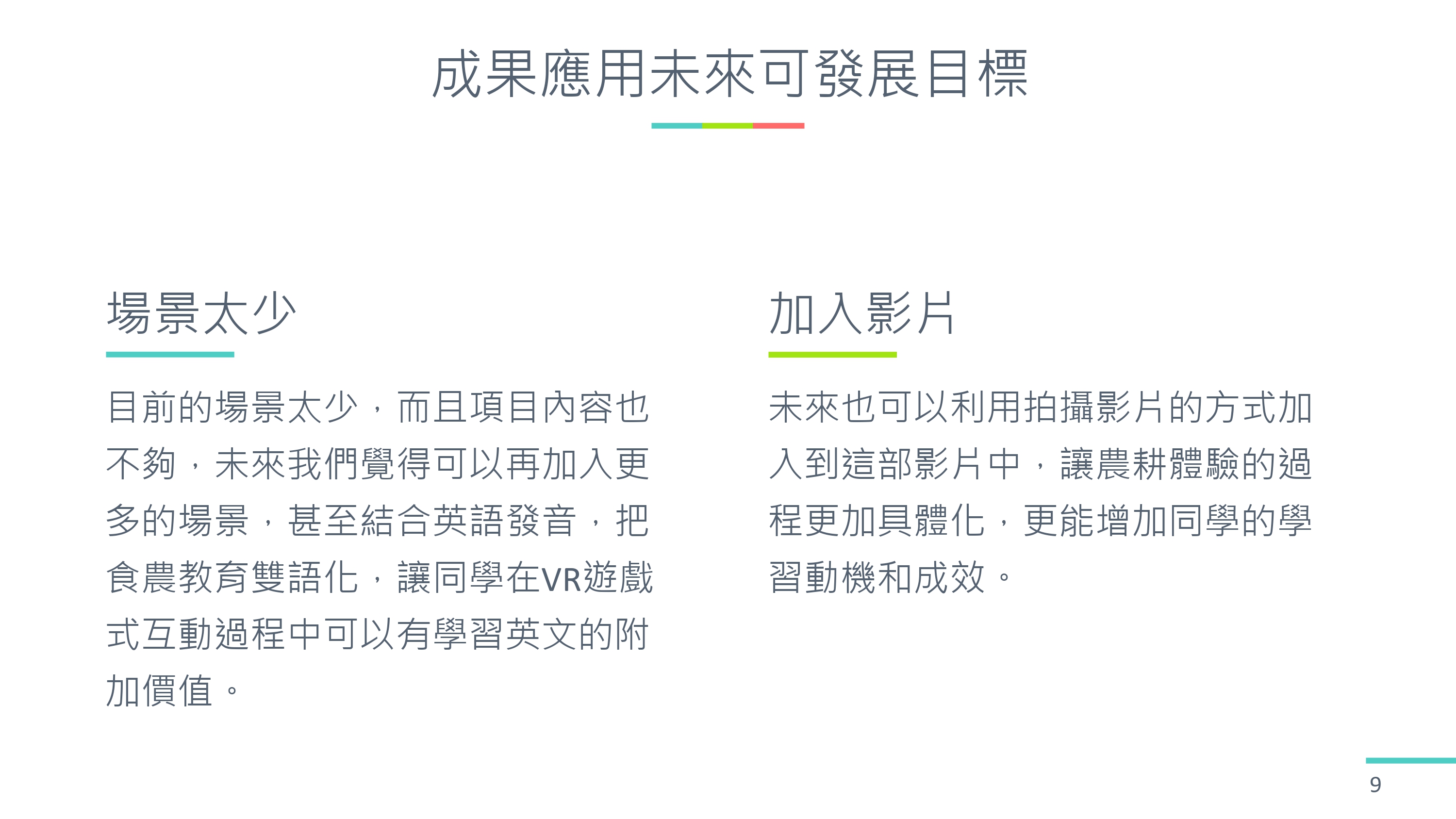 2. 這個 VR 影片可以讓整個農耕體驗的學習過程更加深刻,先透過 VR 影片的介紹,讓學生先熟悉整個種植體驗的流程,學生在實際操作時,才可以更加的熟練。老師也可以透過 VR 影片進行遠距教學,讓學生對農耕體驗有更進一步的認識。