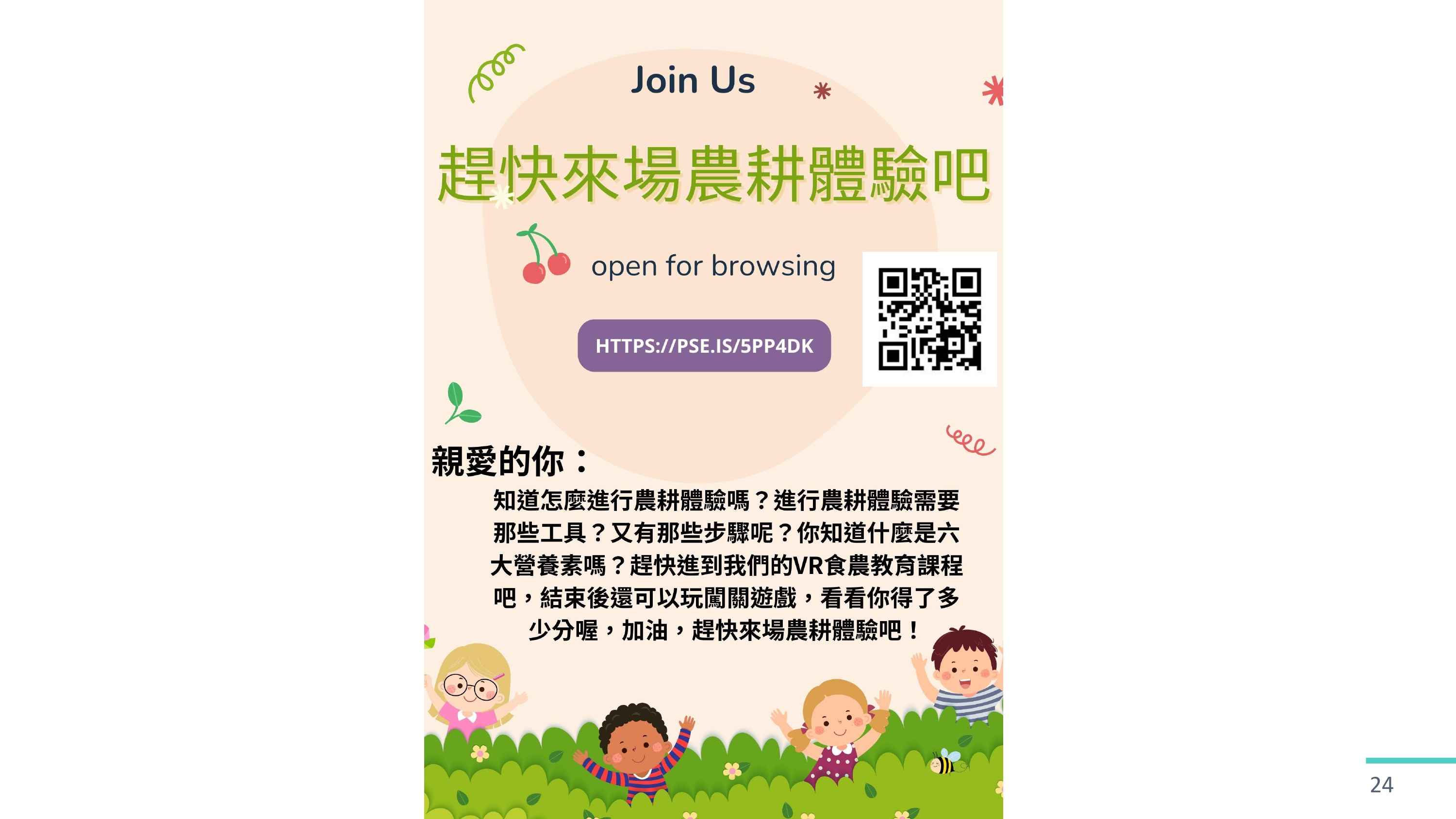 「福開心」,創作作品「食農教育課程」,來自高雄市鳳山區福誠國民小學,榮獲2023 XR 實境教育創意大賞 學生組-國小組:XR 新媒體內容創作 優勝獎。