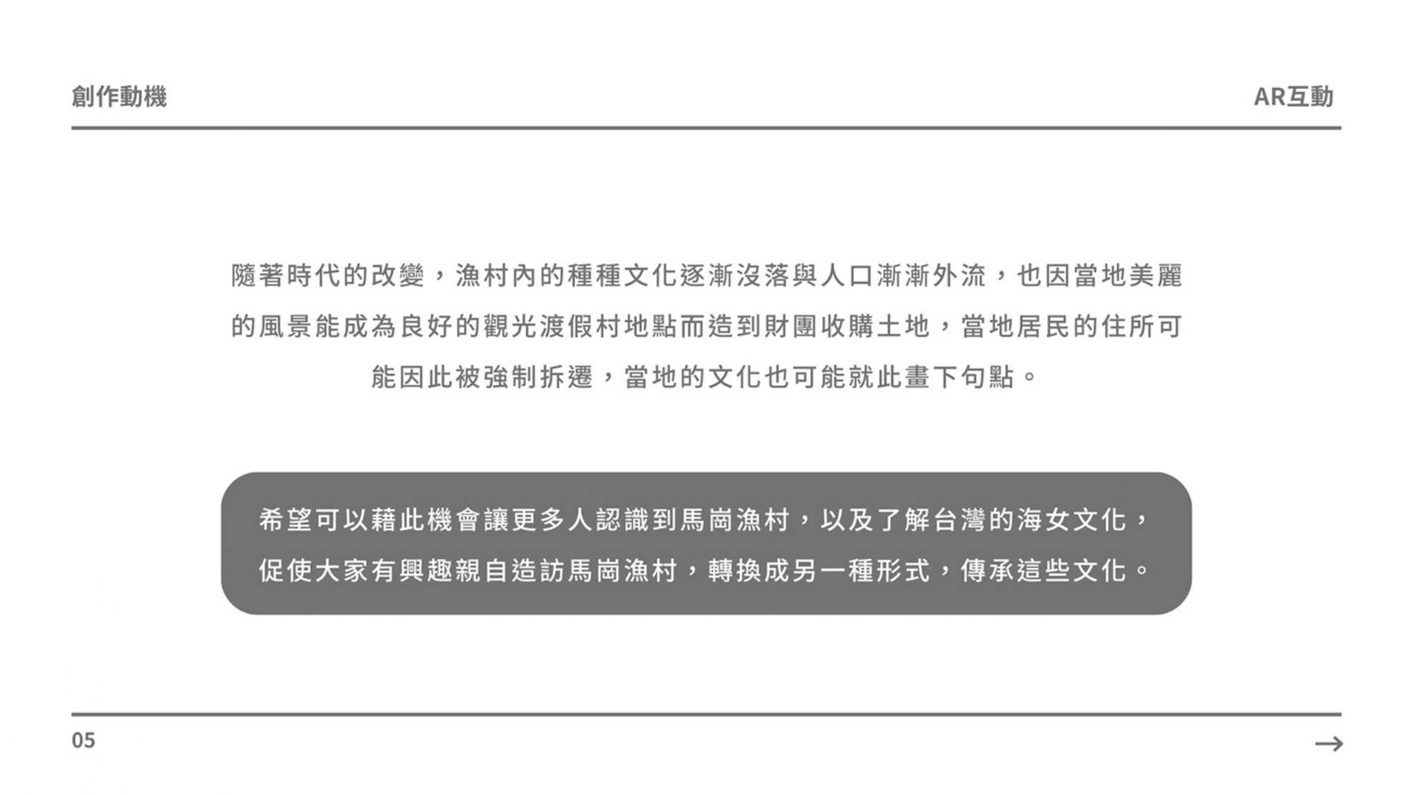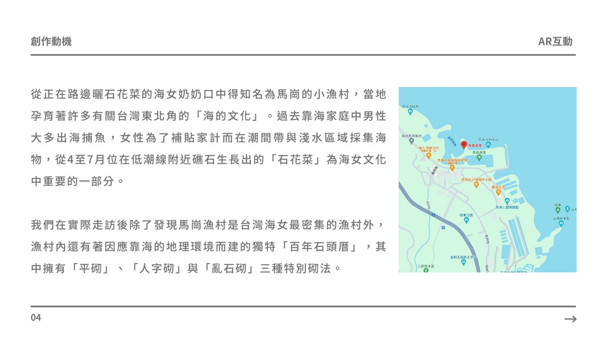 馬崗當地孕育許多有關台灣東北角的「海的文化」,而我們在實際走訪後除了發現馬崗漁村是台灣海女最密集的漁村外,漁村內還有因靠海的地理環境而建的獨特「百年石頭厝」。隨著時代的改變,漁村內的種種文化逐漸沒落與人口外流,再加上財團收購土地,使得當地居民的住所可能因此被強制拆遷。希望可以藉此機會讓更多人認識到馬崗漁村,以及了解台灣的海女文化,促使大家有興趣親自造訪馬崗漁村,傳承這些文化。