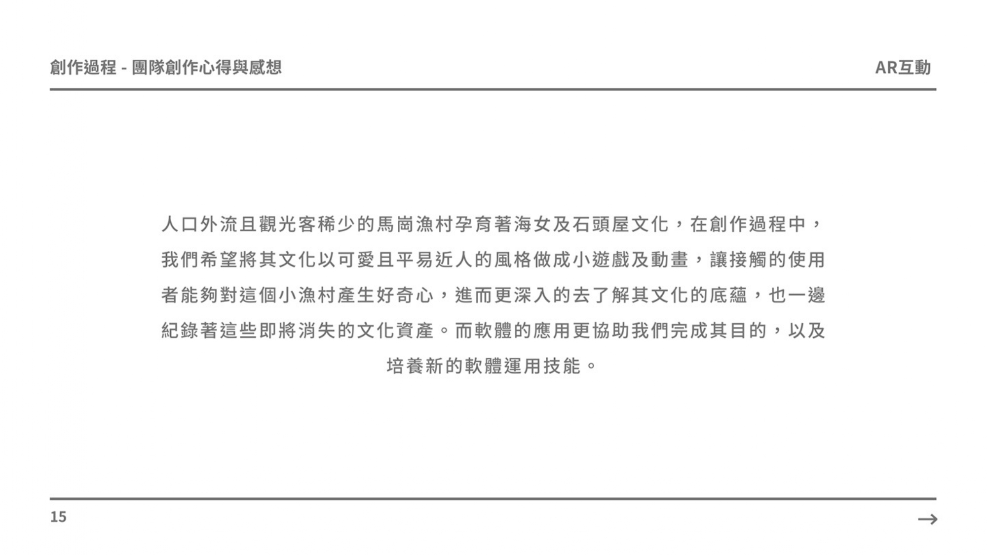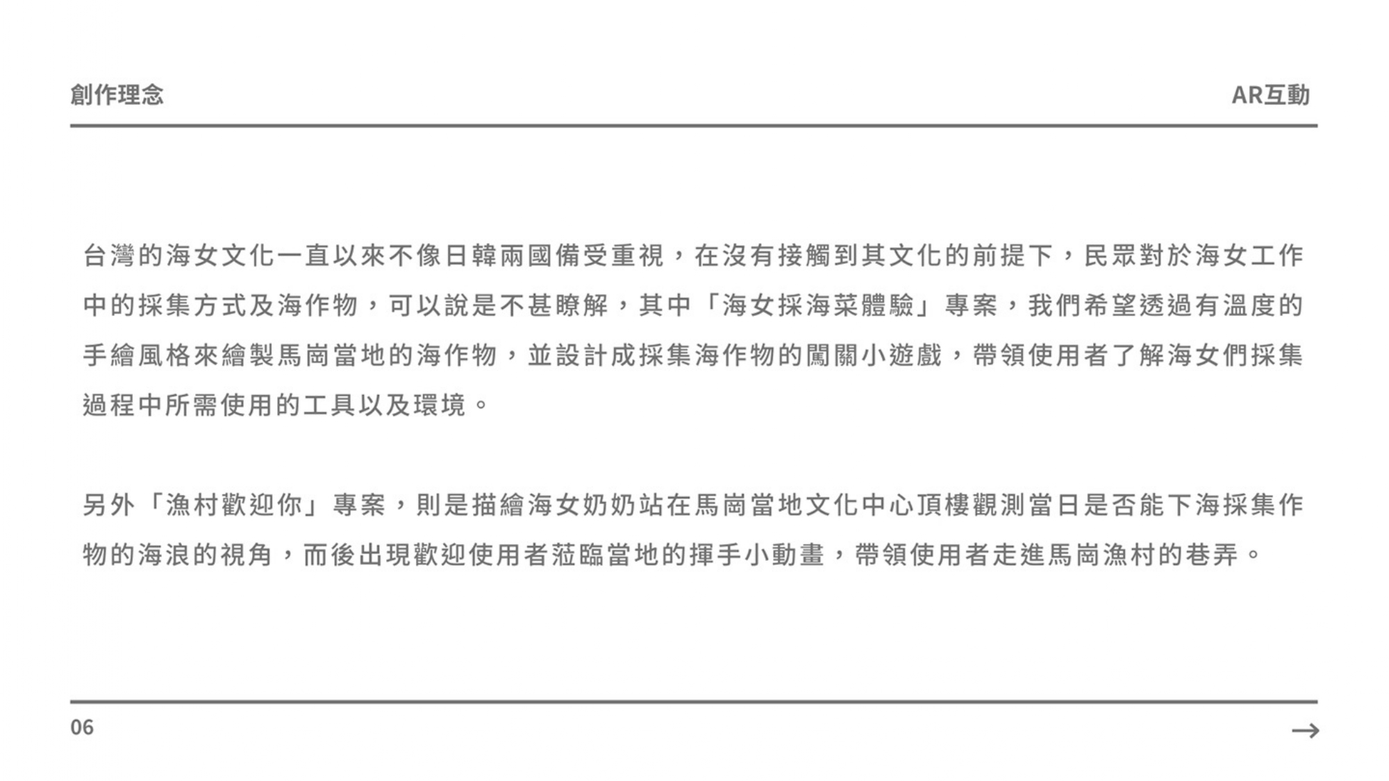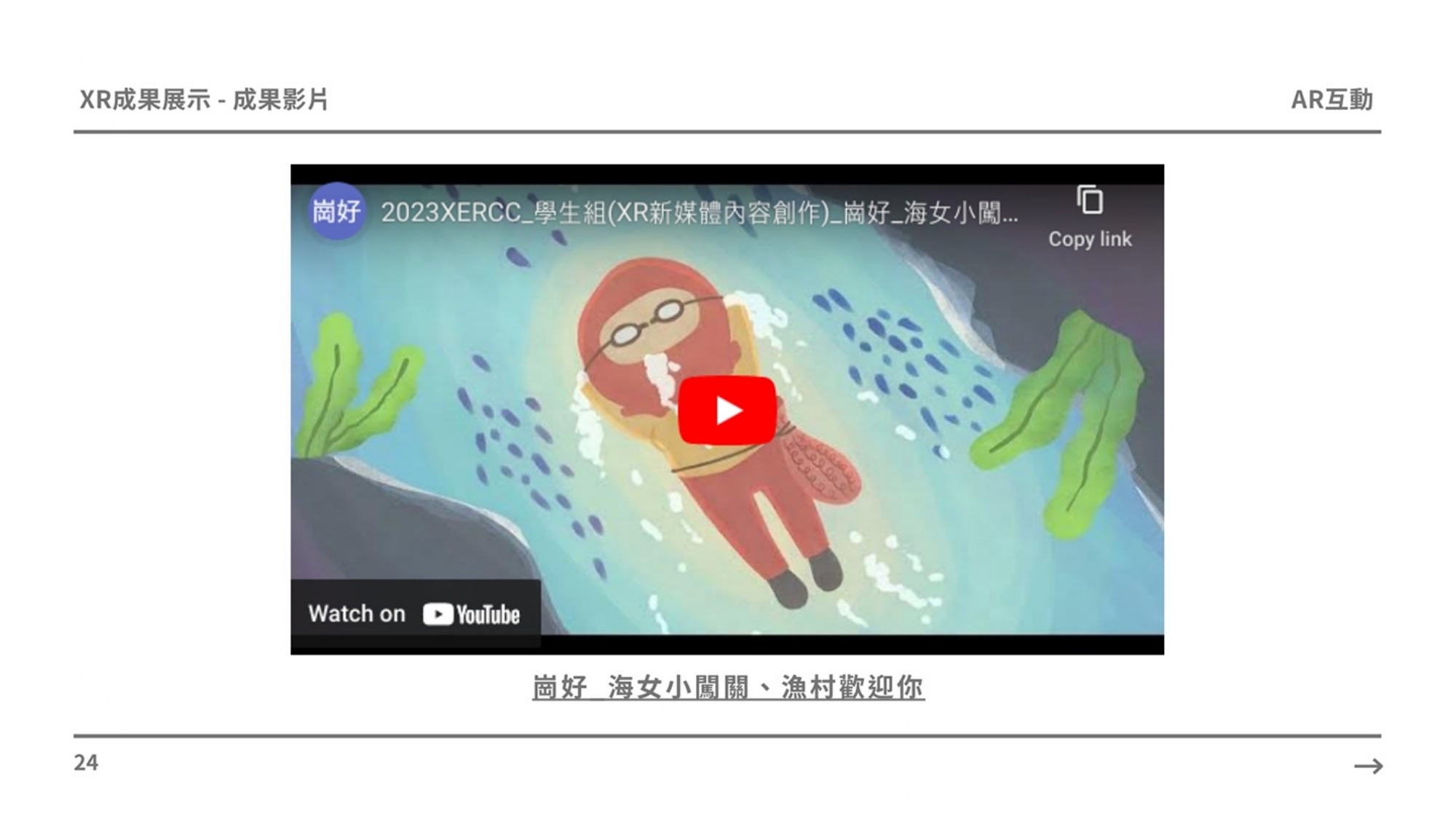 「 崗好」,創作作品「海女採海菜體驗&漁村歡迎你」,來自銘傳大學(桃園校區),榮獲2023 XR 實境教育創意大賞 學生組-大專院校組:XR 新媒體內容創作 優勝獎。