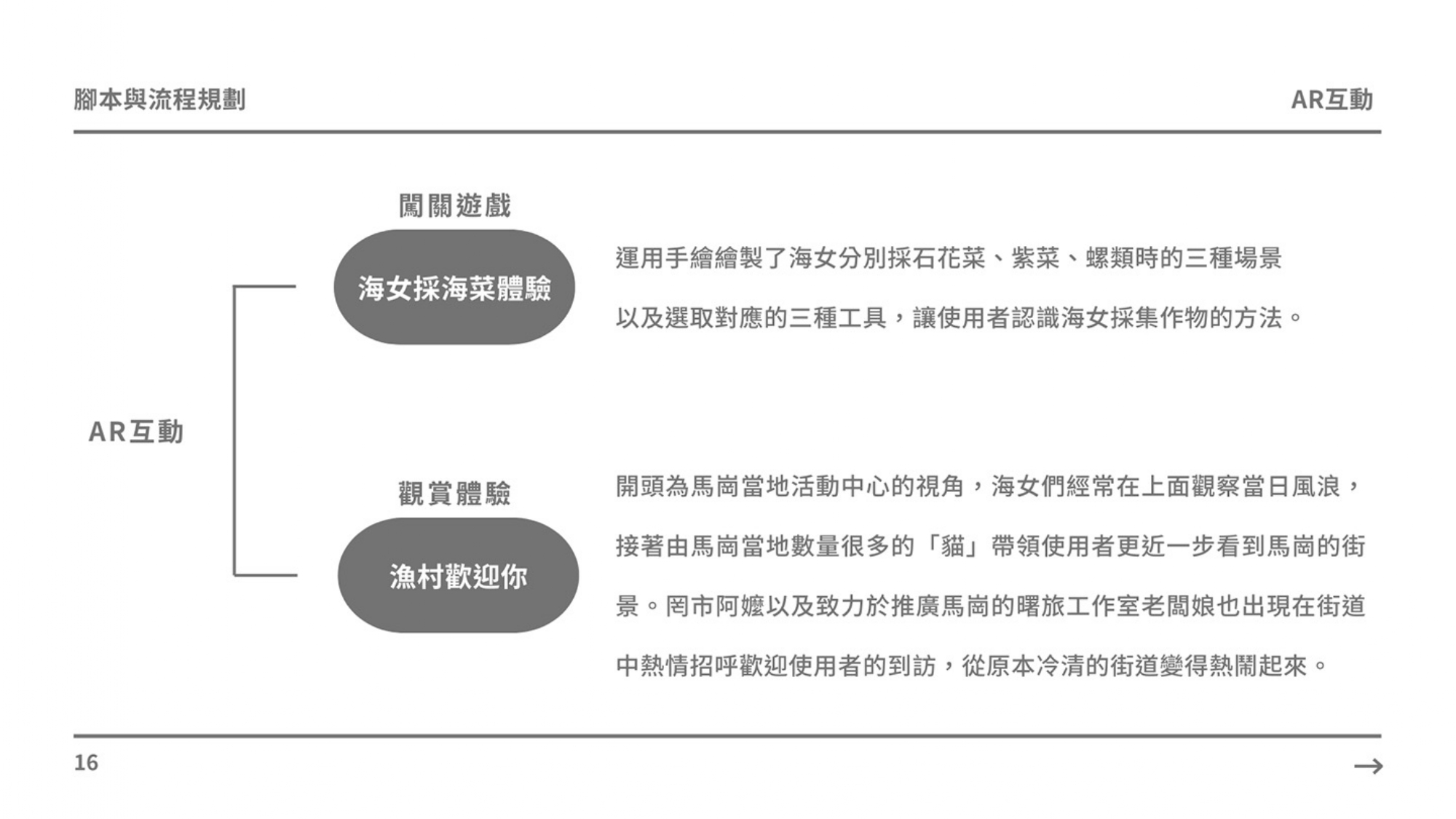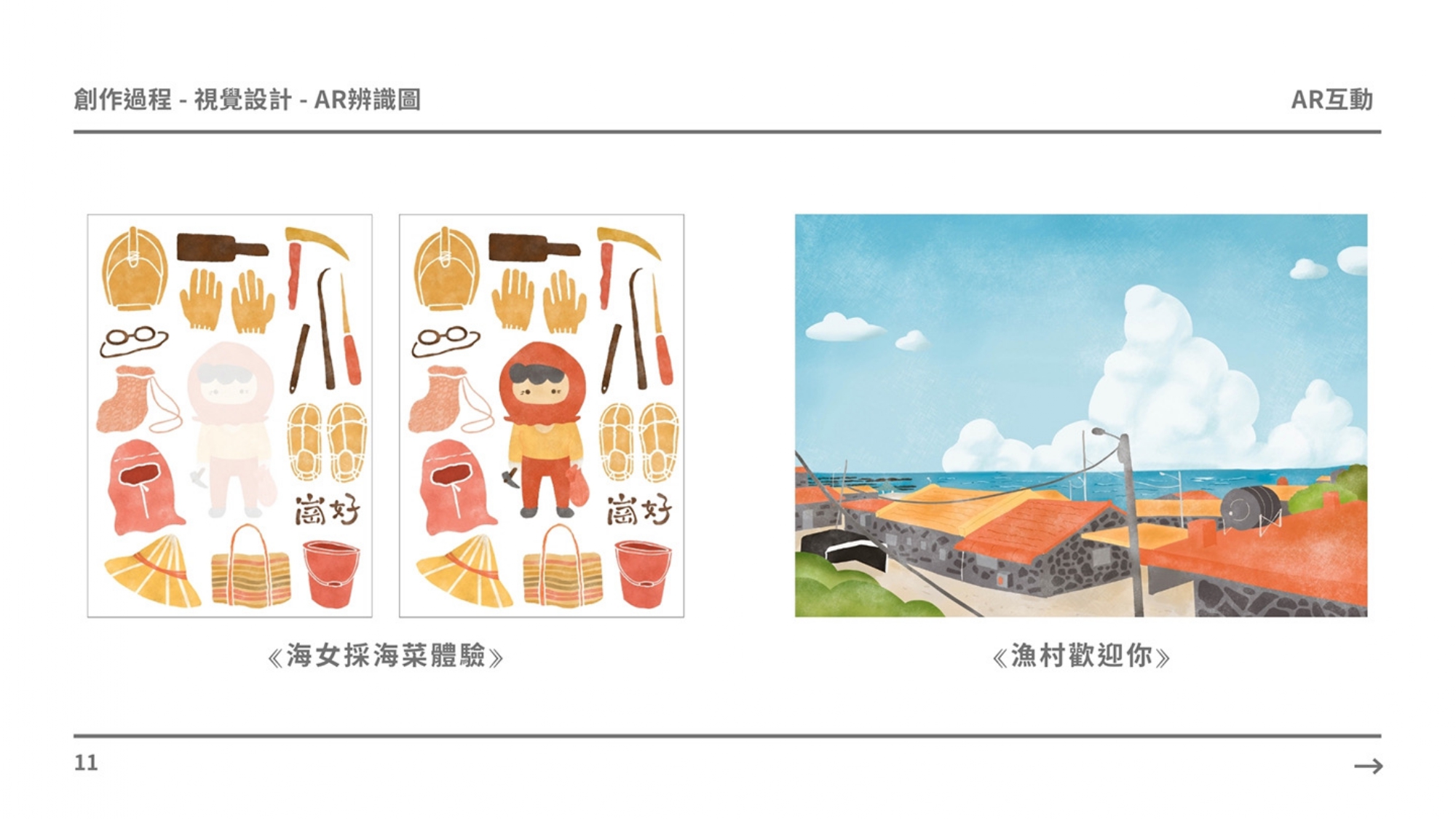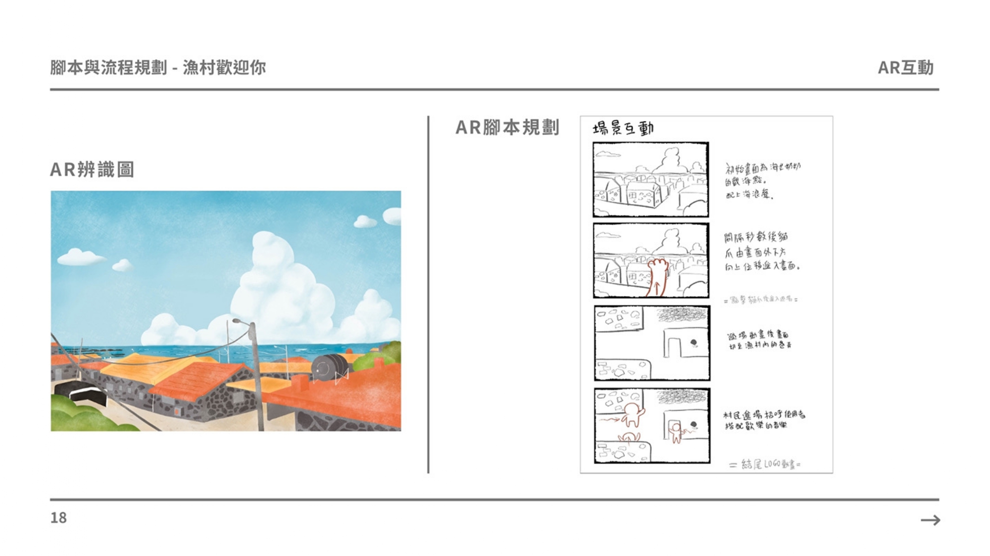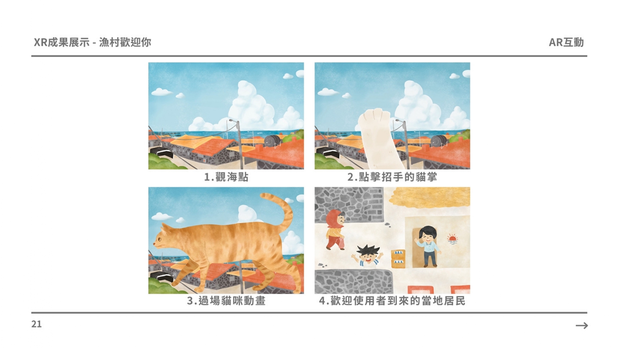 漁村歡迎你(觀賞體驗):AR 辨識圖的畫面為馬崗社區發展協會活動中心屋頂上所觀看到的場景,點擊貓爪後,由當地小貓帶領使用者能更近一步看到馬崗的街景,同時居民們也會出現在街道中熱情招呼歡迎使用者的到訪,從原本冷清的街道變得熱鬧起來。