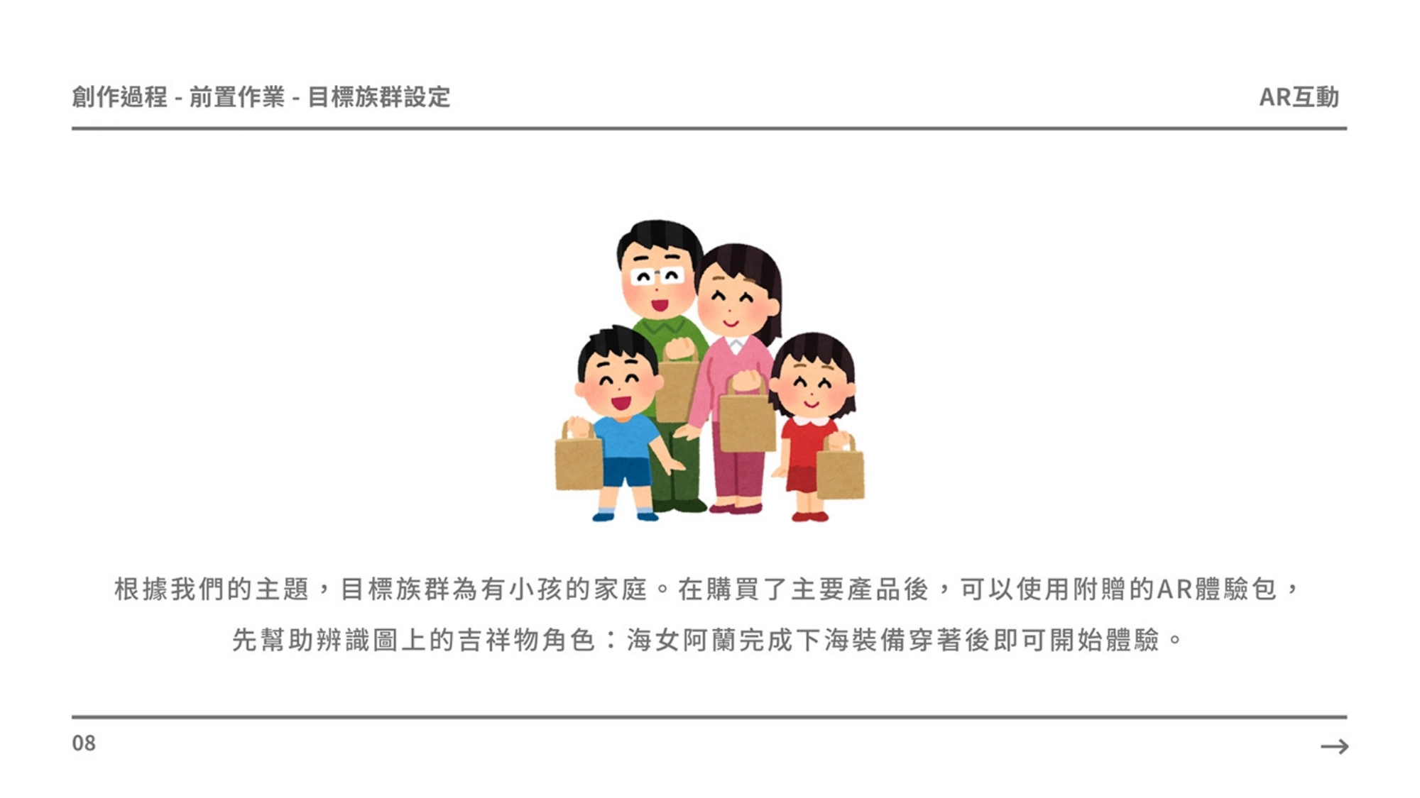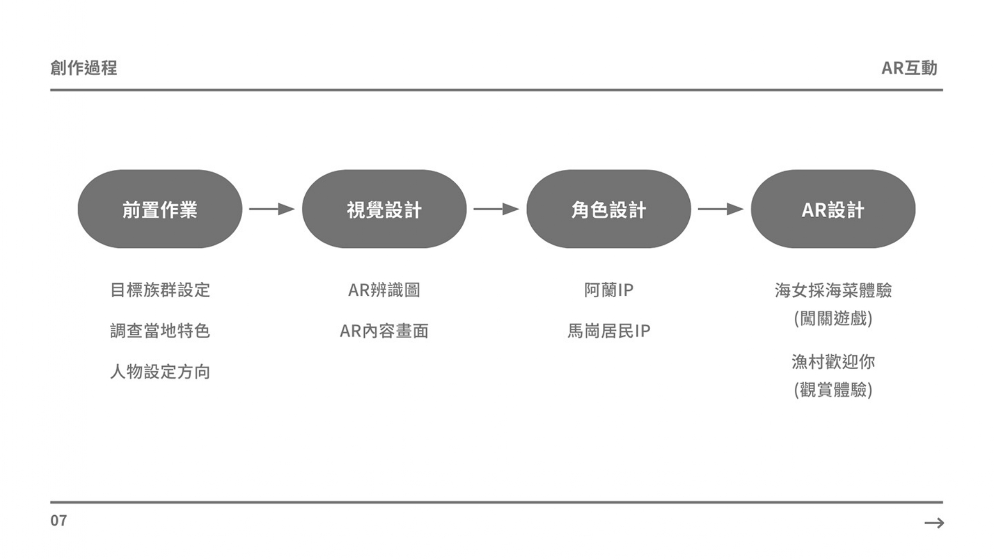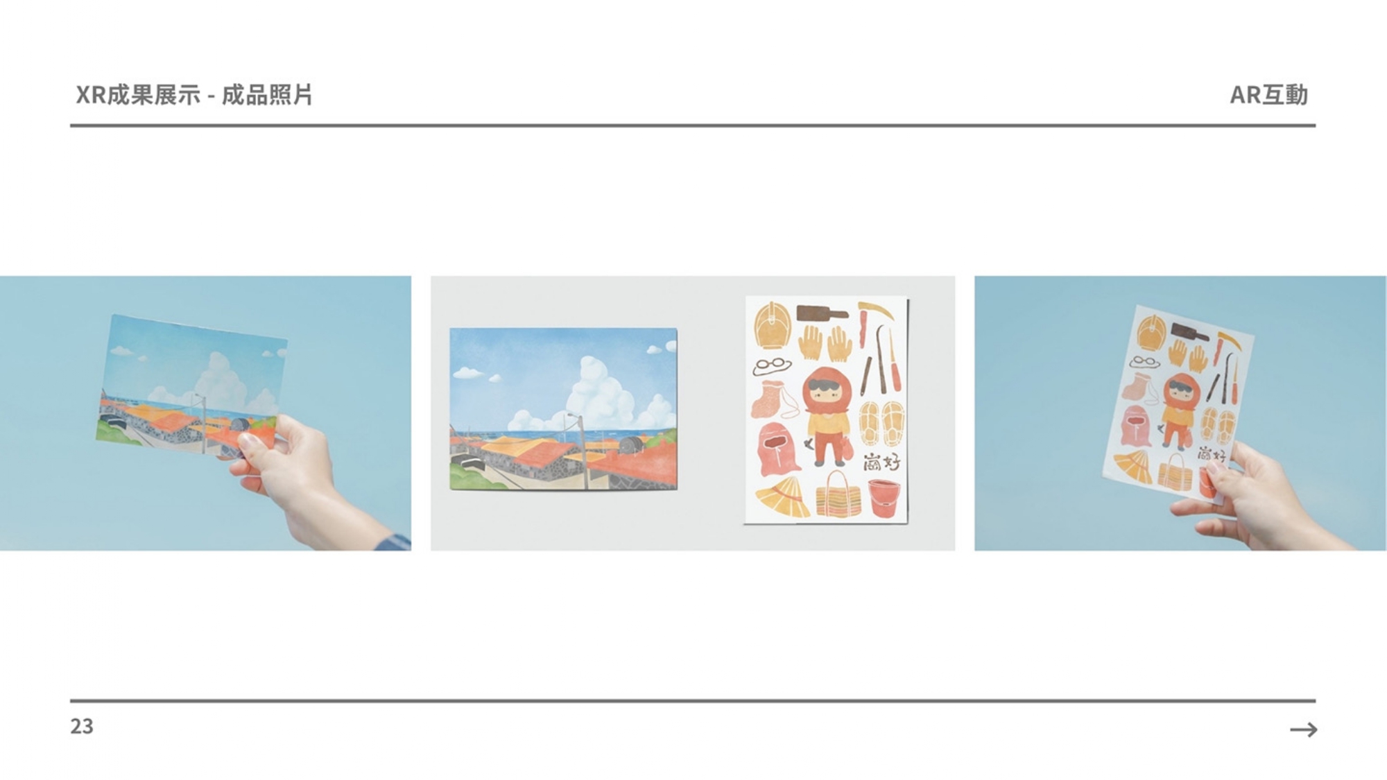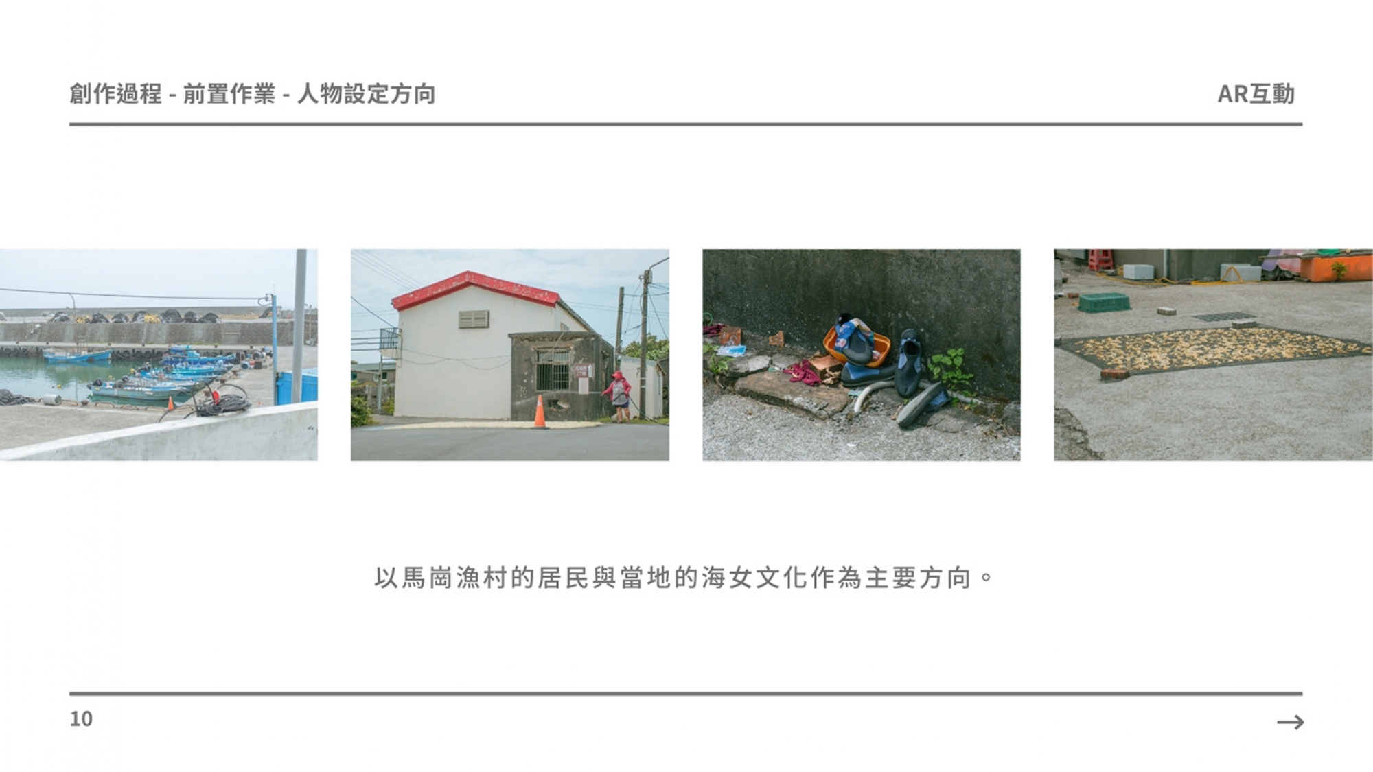 漁村歡迎你(觀賞體驗):AR 辨識圖的畫面為馬崗社區發展協會活動中心屋頂上所觀看到的場景,點擊貓爪後,由當地小貓帶領使用者能更近一步看到馬崗的街景,同時居民們也會出現在街道中熱情招呼歡迎使用者的到訪,從原本冷清的街道變得熱鬧起來。