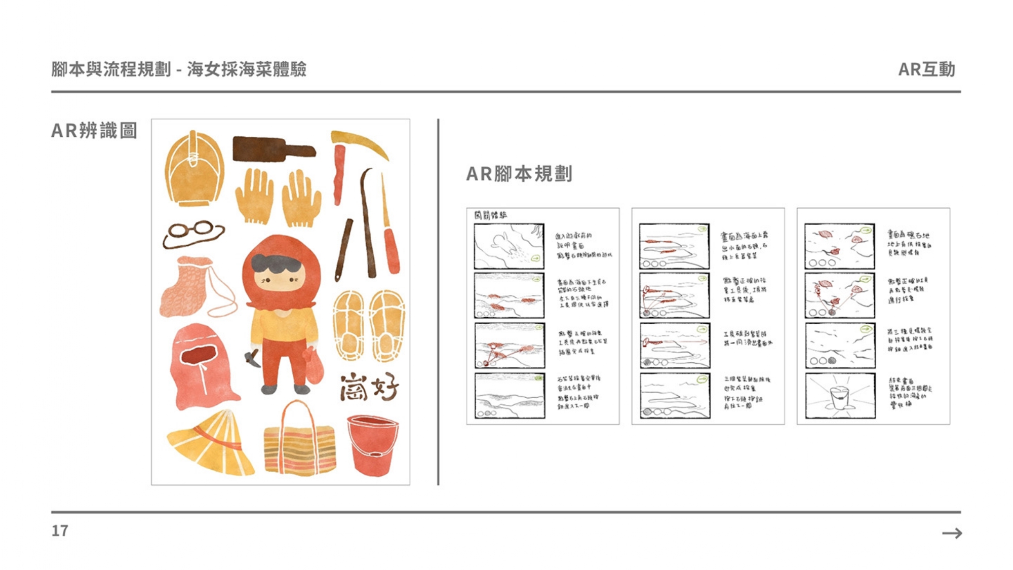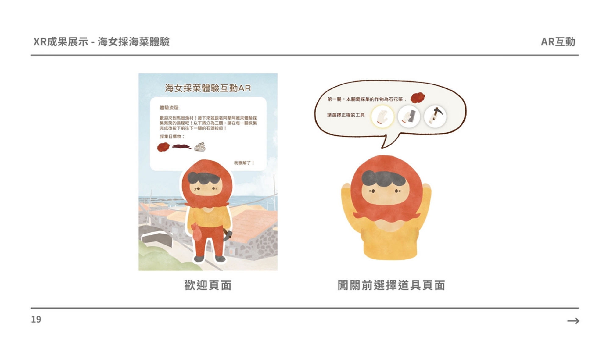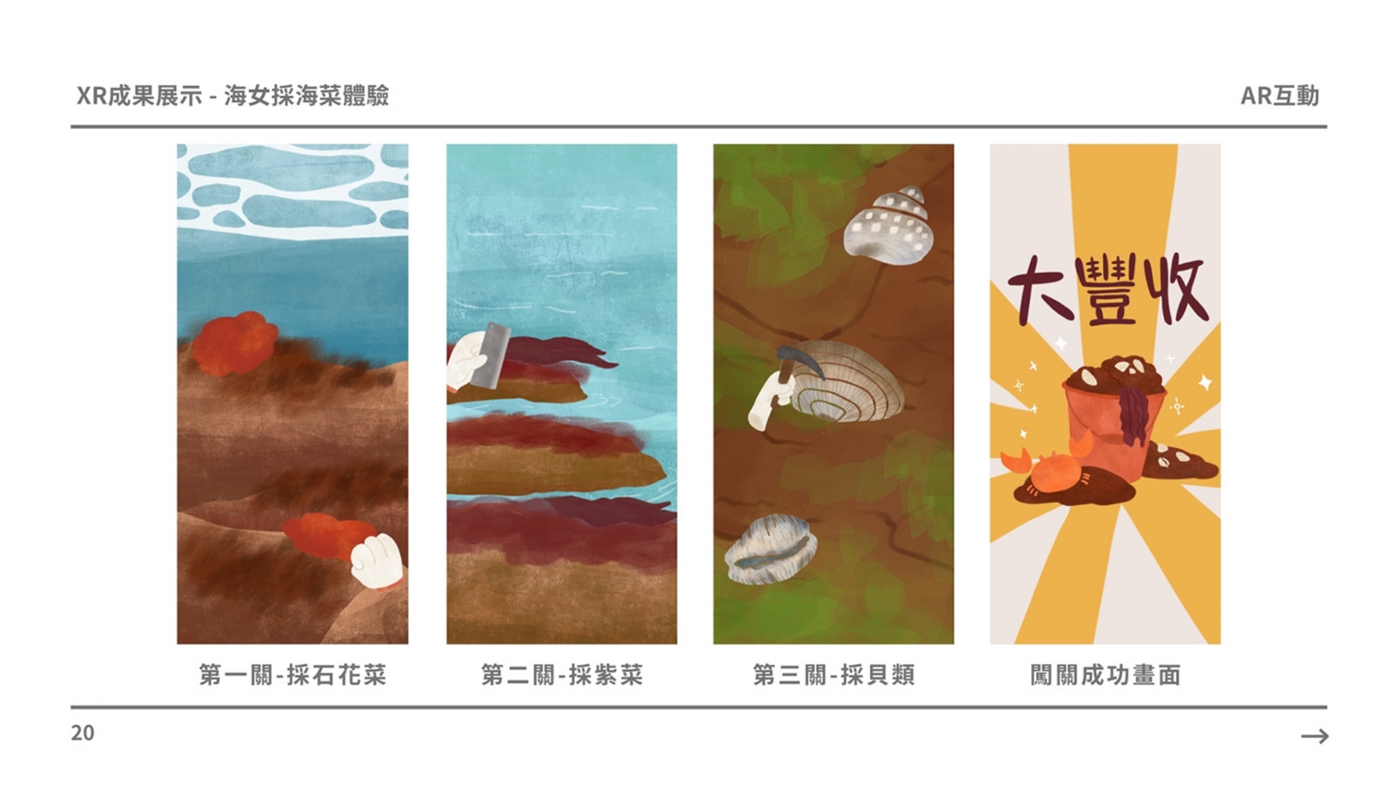 海女小闖關(闖關遊戲):運用海女採收作物(石花菜、紫菜、螺類)的三種場景以及選取對應的三種工具,讓使用者認識海女採集作物的方法。