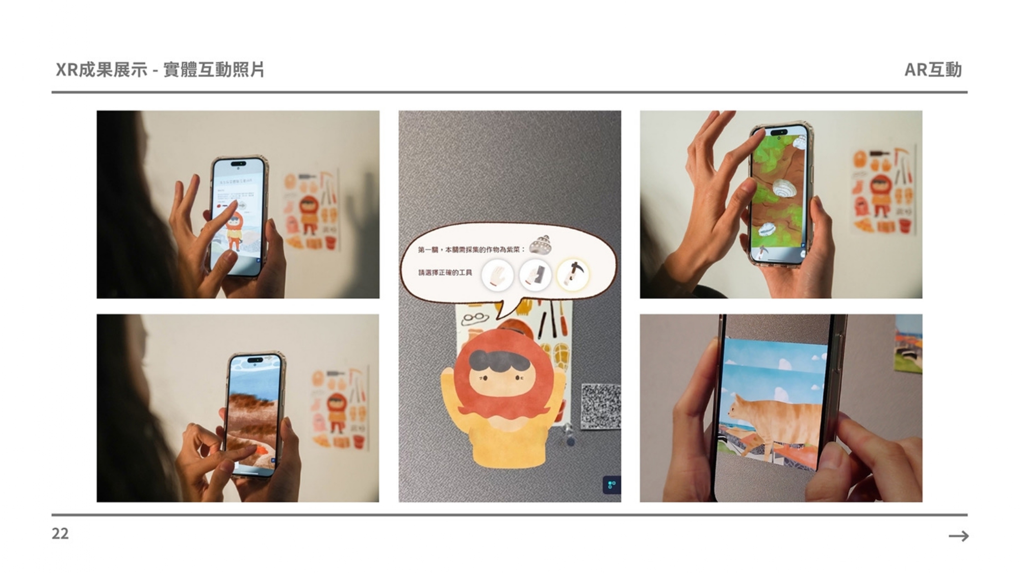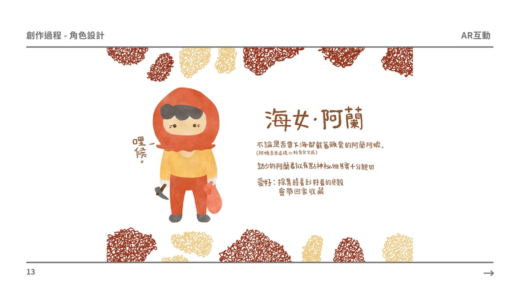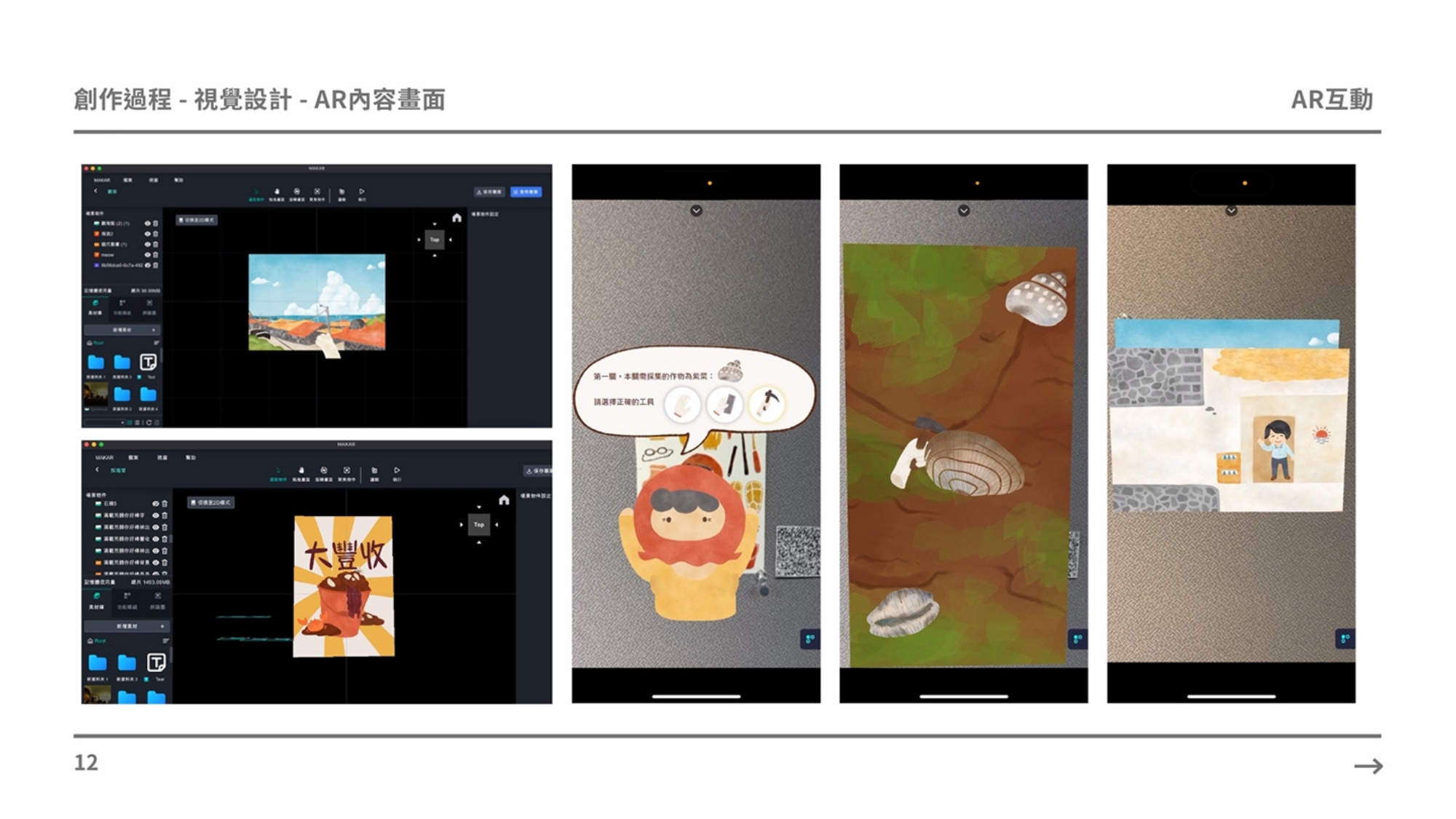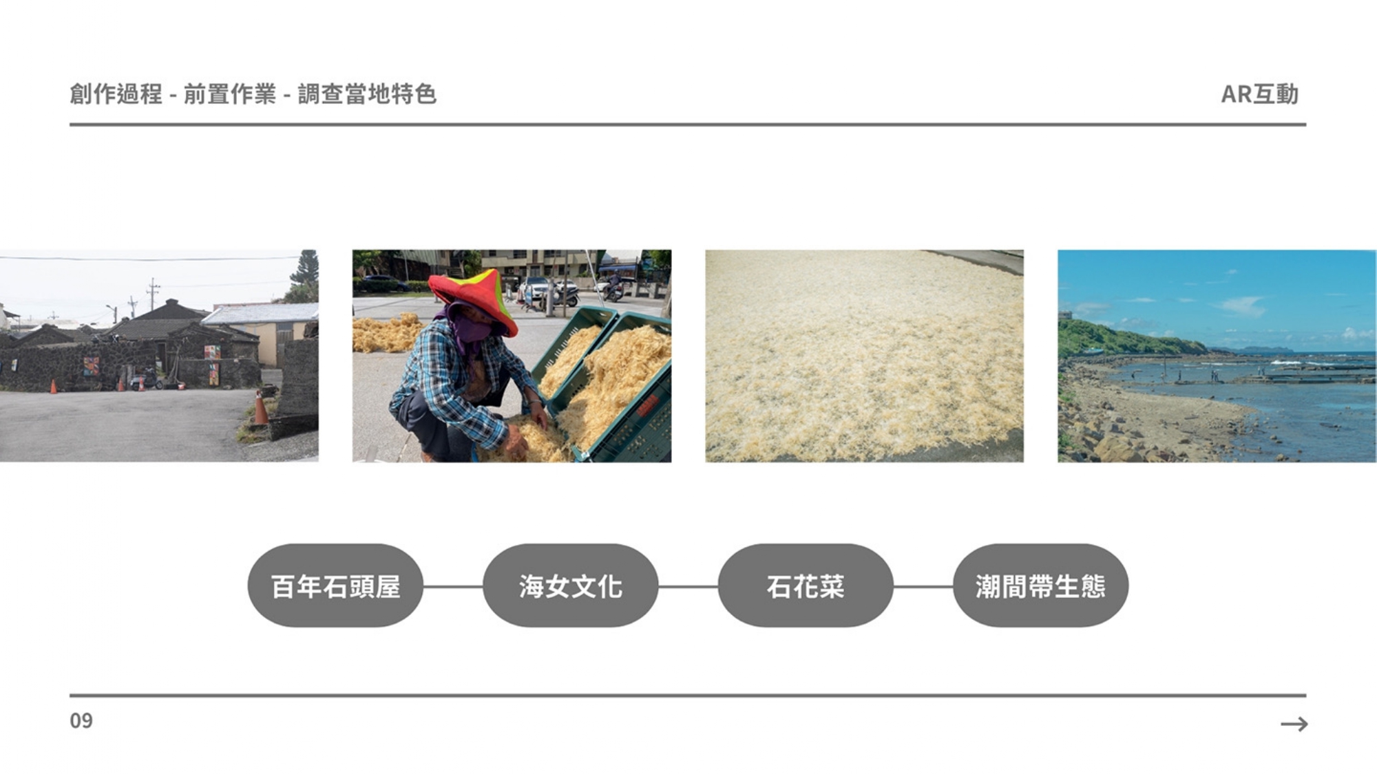 海女小闖關(闖關遊戲):運用海女採收作物(石花菜、紫菜、螺類)的三種場景以及選取對應的三種工具,讓使用者認識海女採集作物的方法。