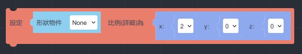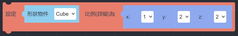 範例:將積木設定為「設定 Cube 比例(詳細)為 x:1, y:2, z:2」,觸發時 Cube 即依照數值改變比例。