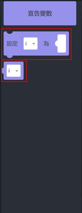 2. 建立變數後,在變數的區域會出現「設定 i 為 _____」和變數「i」