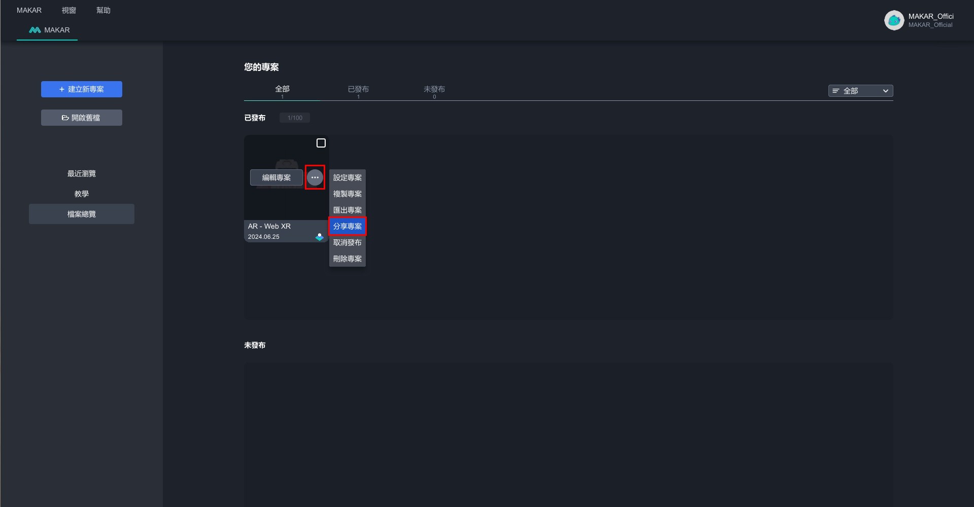 1. 在 MAKAR Editor 首頁,選擇已完成的專案點擊「