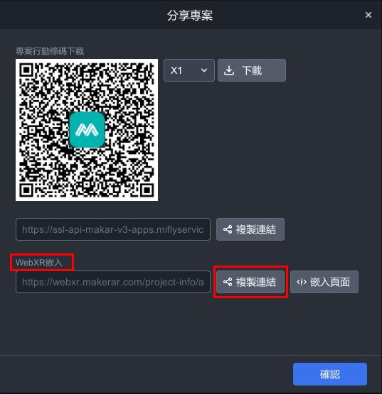 2. 跳出分享專案視窗,在 Web XR 點選「複製連結」,將複製的連結傳至您的手機或平板。