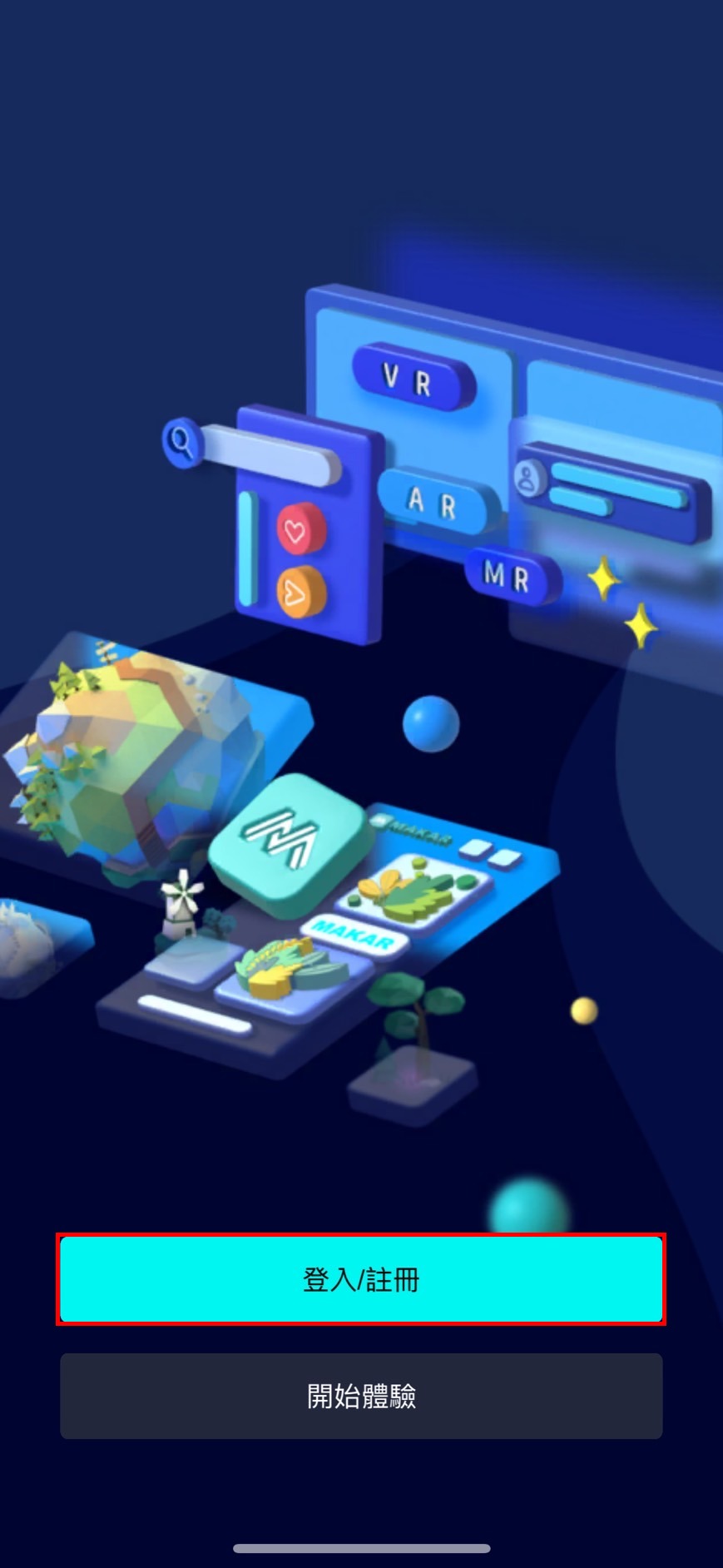 | 1. 在您的行動裝置上點擊 MAKAR Viewer。 | 2.點選「登入/註冊」。 |