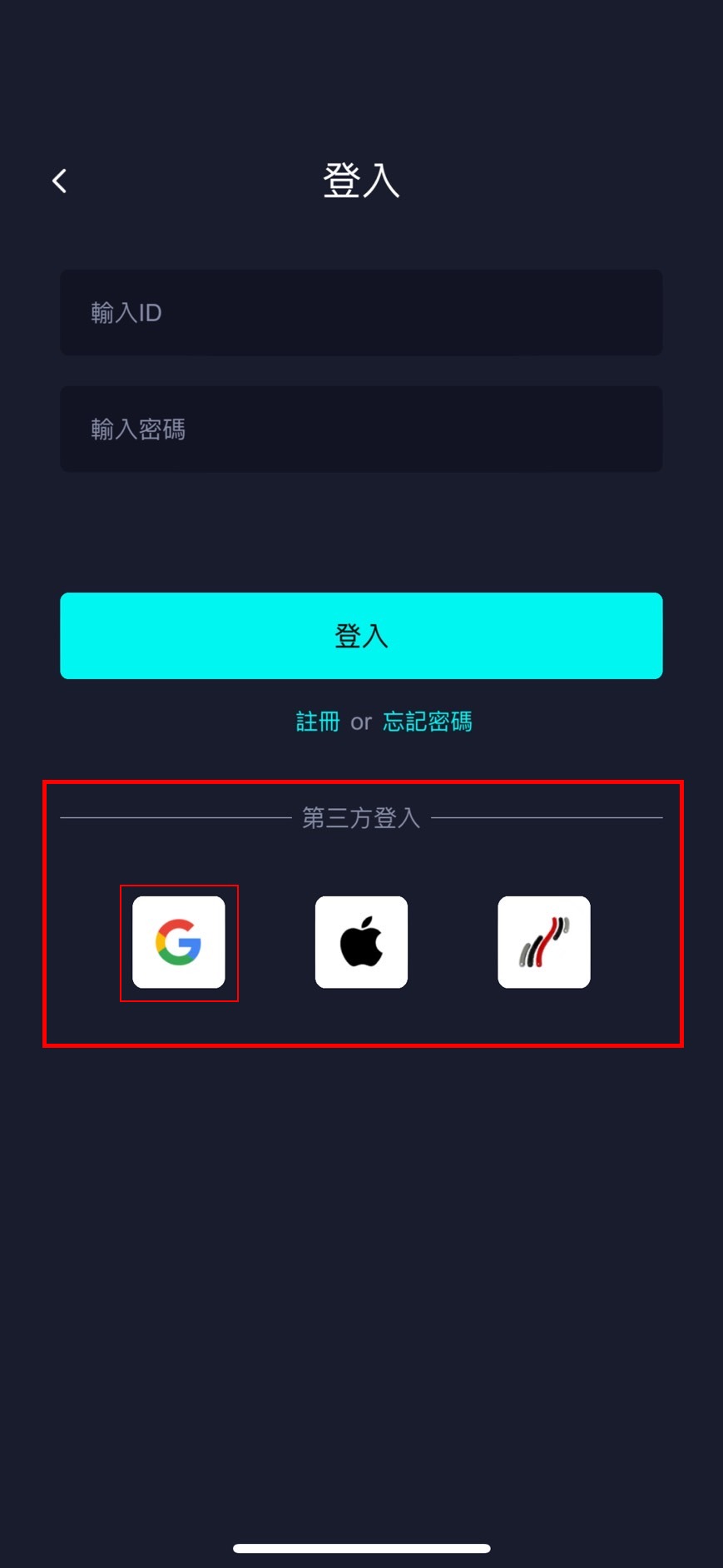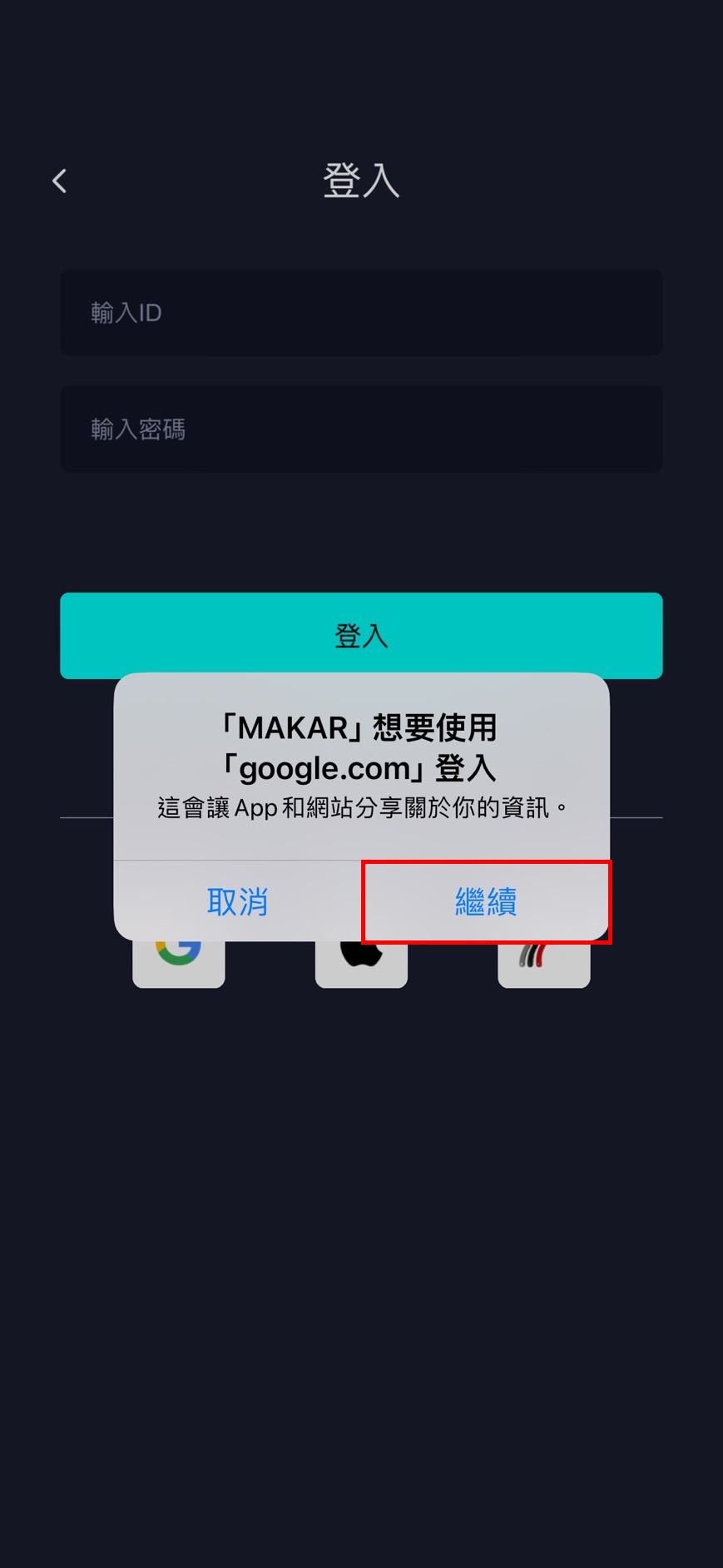 | 3. 進入登入頁面,下方有三種第三方登入的icon,點選最左側的 Google icon。 | 4. 跳出視窗,點選「繼續」。 |