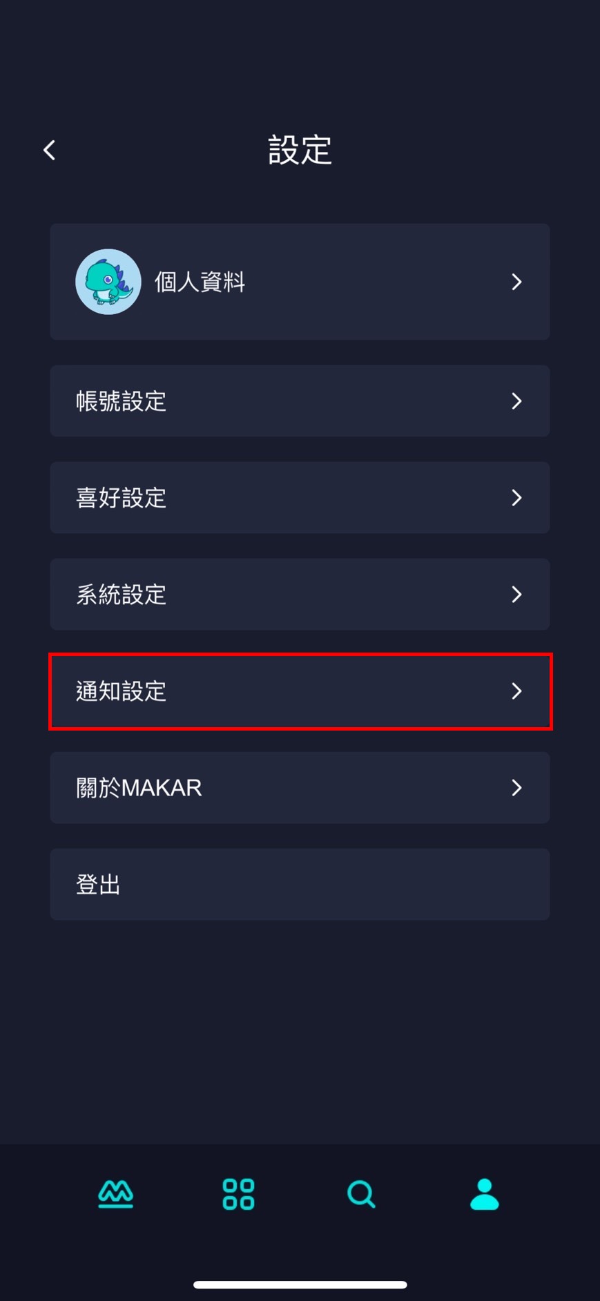 1. 點選右下角人像「icon1」。 2. 進入設定的畫面,點選「通知設定」。