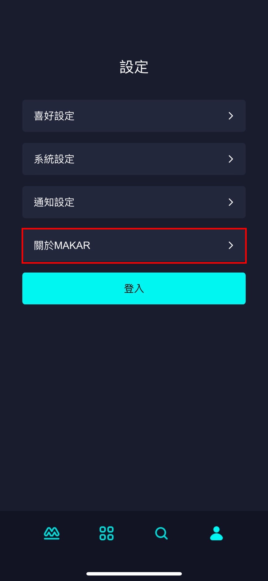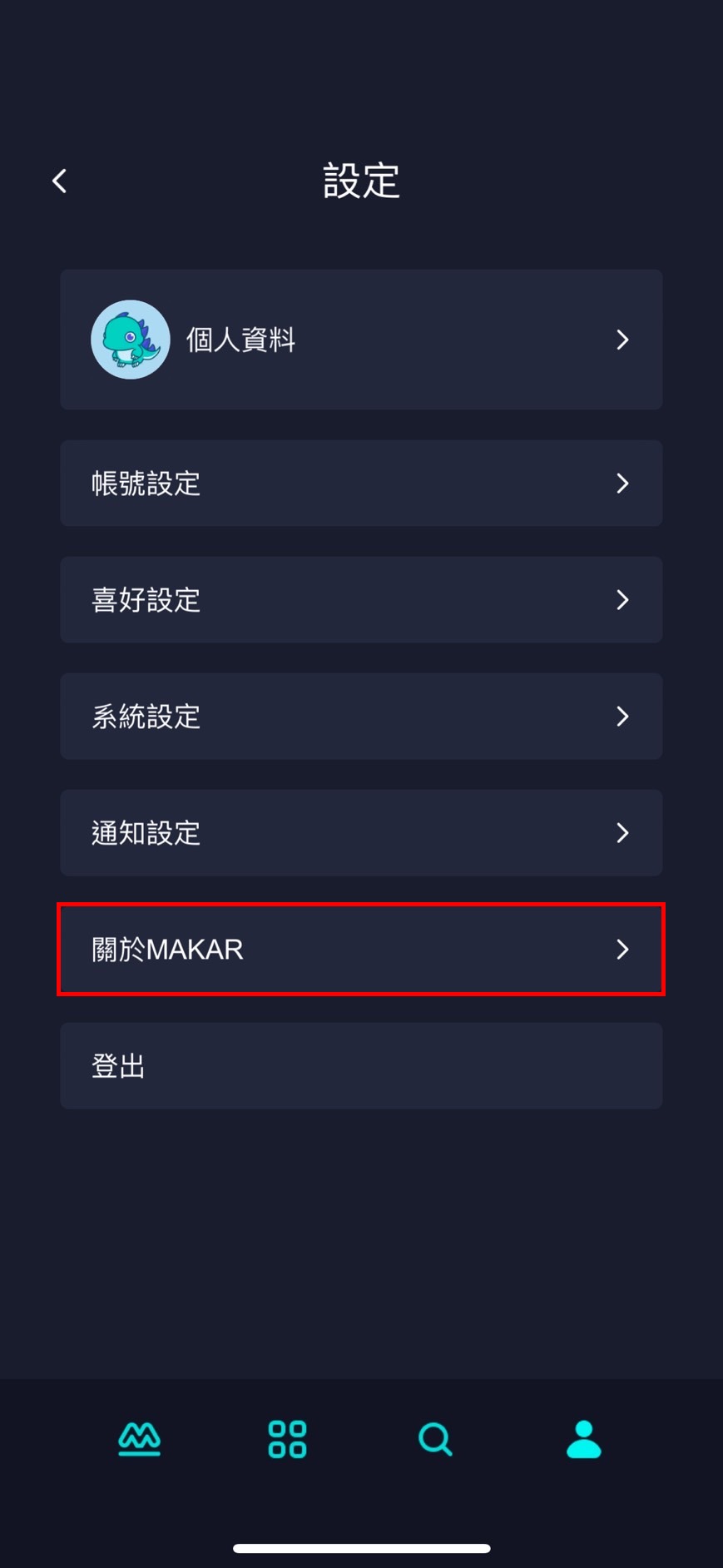 | 1. 點選右下角人像 icon。 | 2. 進入設定的畫面,點選「關於 MAKAR」。 |