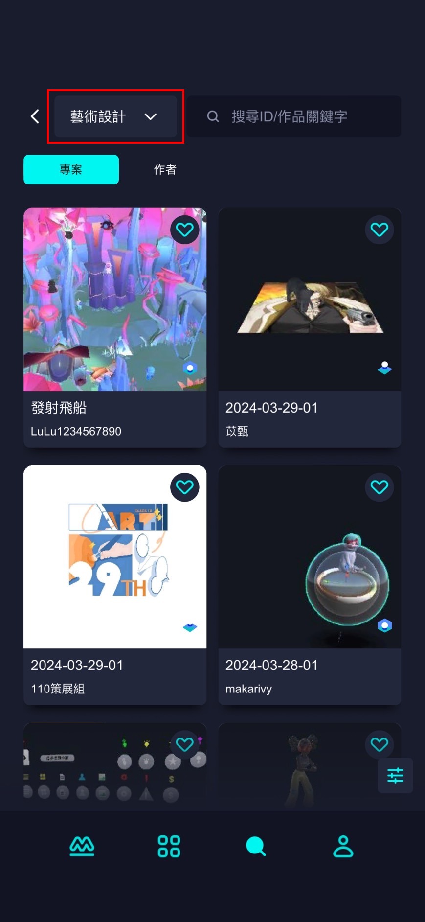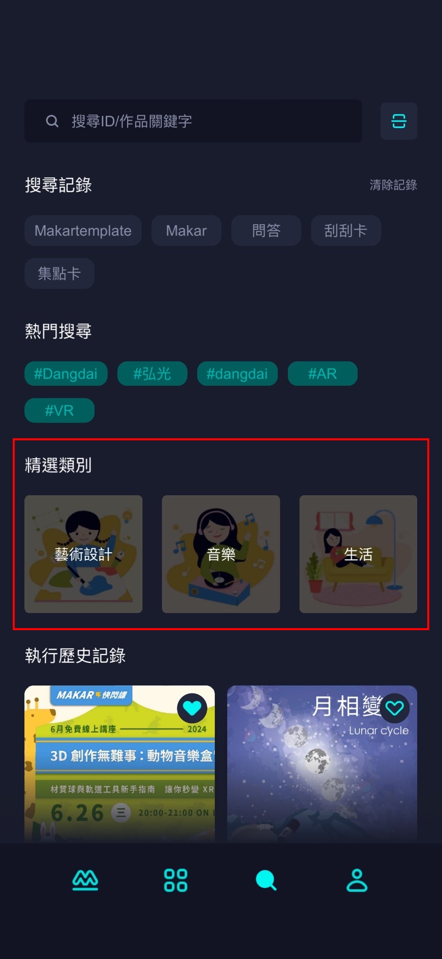 在 MAKAR Viewer 的搜尋頁面中有「查看精選類別」區域,包括藝術設計、音樂、生活、教育和攝影等多項類別,這些類別方便使用者瀏覽各領域的專案。