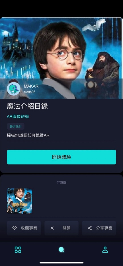 點擊AR圖像辨識「魔法介紹目錄」專案啟動,點擊「開始體驗」對準海報。
