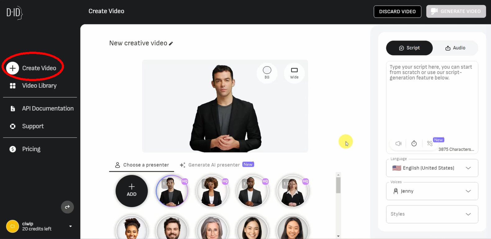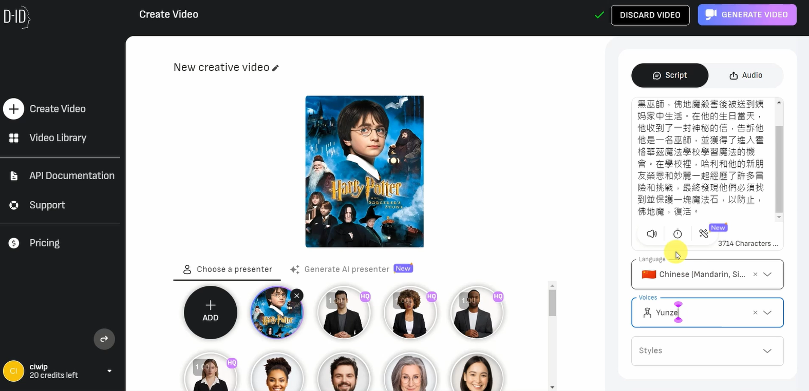 將文字檔中的內容貼入右邊的Script中,並語言選擇Chinese(Mandarin, Simplified),Voice選擇Yunze之後就可以點選右上角Generate Video輸出影片。另外,除了Script能夠文字轉語音以外,也能夠用Audio上傳自己的聲音。