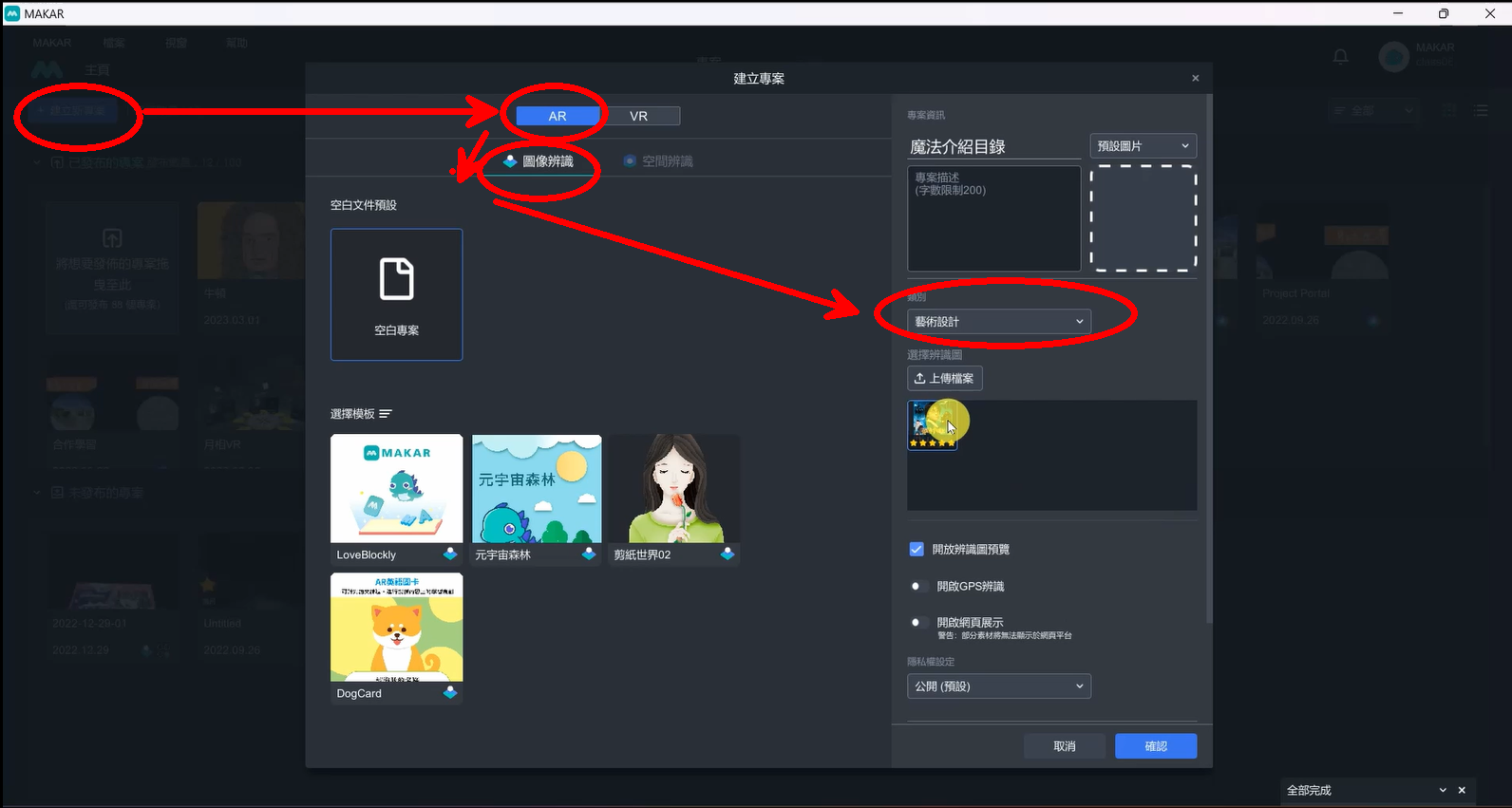 開啟MAKAR編輯器,建立新專案,選擇AR圖像辨識,將電影海報上傳為辨識圖。編輯器v3.4版本以後新增了「類別」選單,若沒有選擇將無法發布專案。
