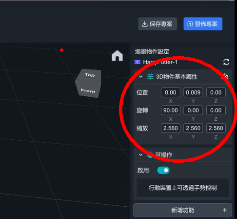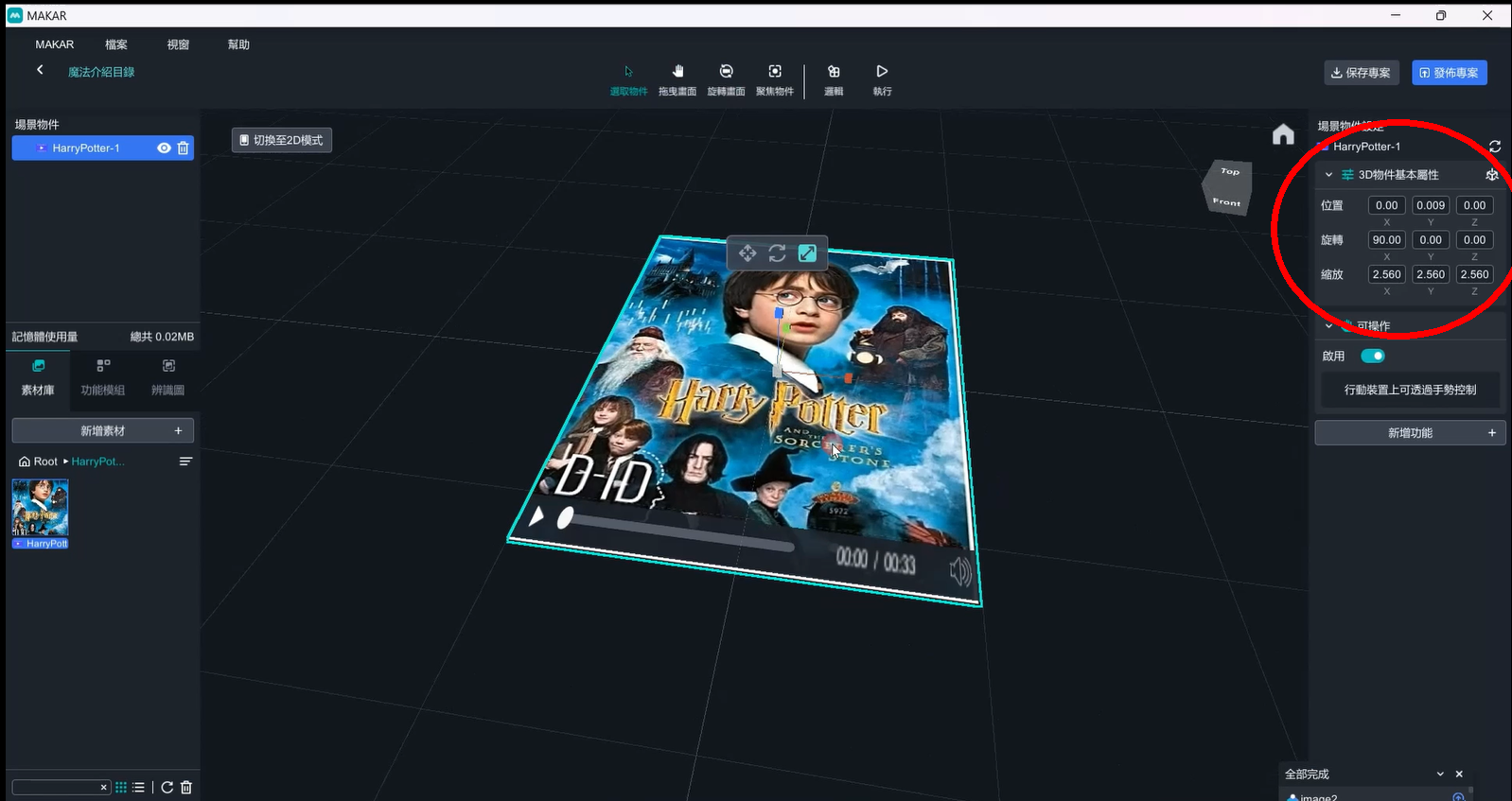 將影片放置於場景中,並平行於辨識圖之上,且大小需剛好覆蓋住海報。可參考下圖的調整數據。