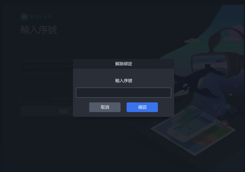 3. 跳出「解除綁定」視窗,輸入原本鎖定的序號後,點擊「確認」,跳出解除成功的視窗。