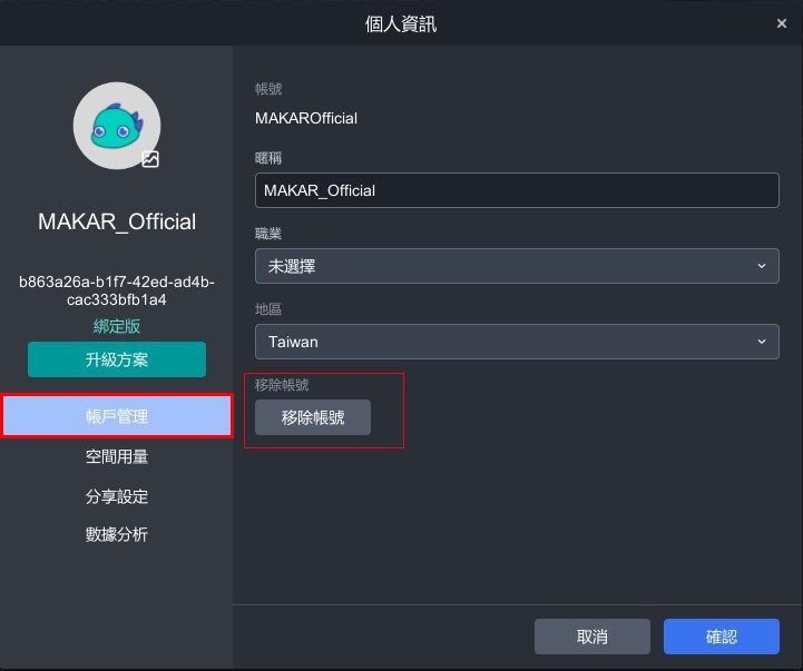 在 MAKAR Viewer 上也能移除您的 MAKAR 帳號,點選「帳號設定」→ 「刪除帳號」即可。