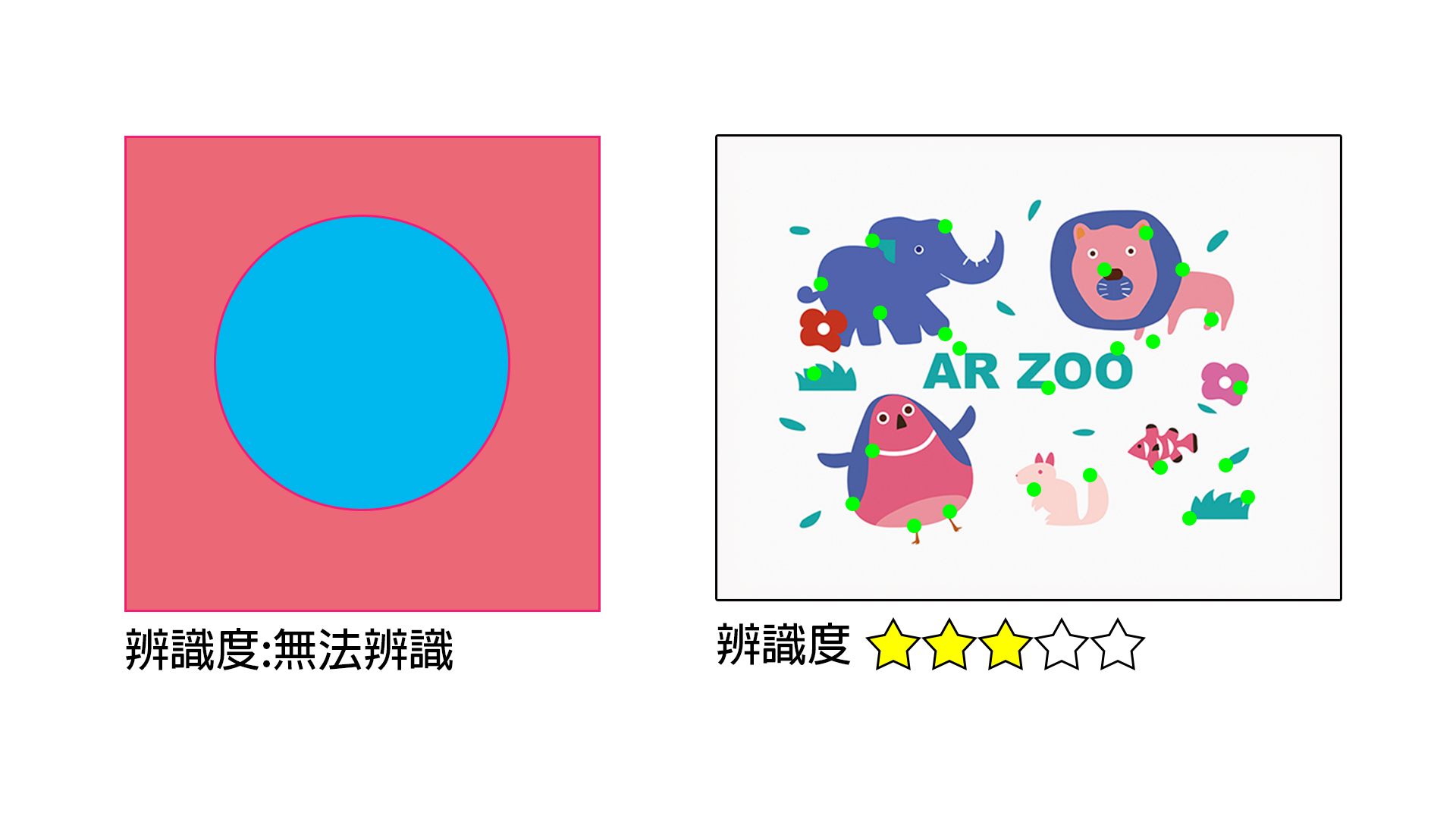 關於辨識圖得先提及一種 AR 技術「圖像辨識(Image Target)」,通常我們上傳辨識圖至 AR 辨識系統中,系統會自動判斷該圖像的辨識度是否可達成辨識功能,若該圖像如左圖,沒有太多的複雜元素,僅有簡單的圓形與方形,那麼辨識度將可能為「無法辨識」;若該圖像為右圖,有較複雜的設計元素與內容,那麼該辨識圖經過圖像辨識系統運算過後,將會提供辨識度 1-5 顆星的結果。而辨識圖的星星多寡,影響的是辨識速度與圖像追蹤率的穩定度。當辨識圖成功完成後,下圖即可看到該辨識圖的特徵點,相較於左圖,右圖的辨識度點與辨識度是相對來得較高的。